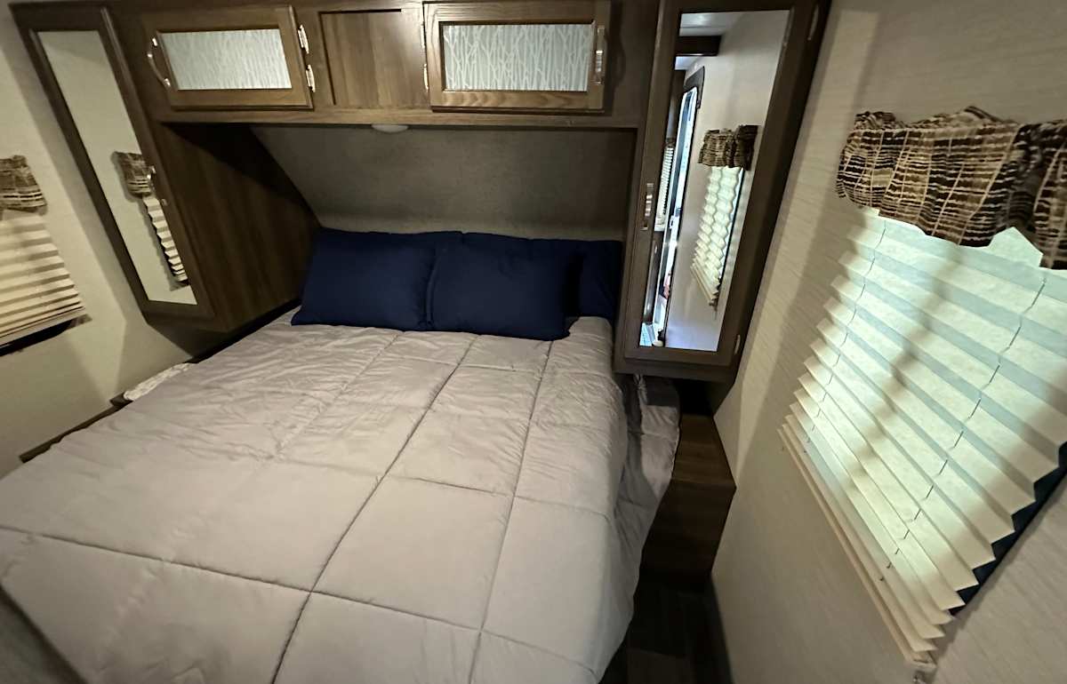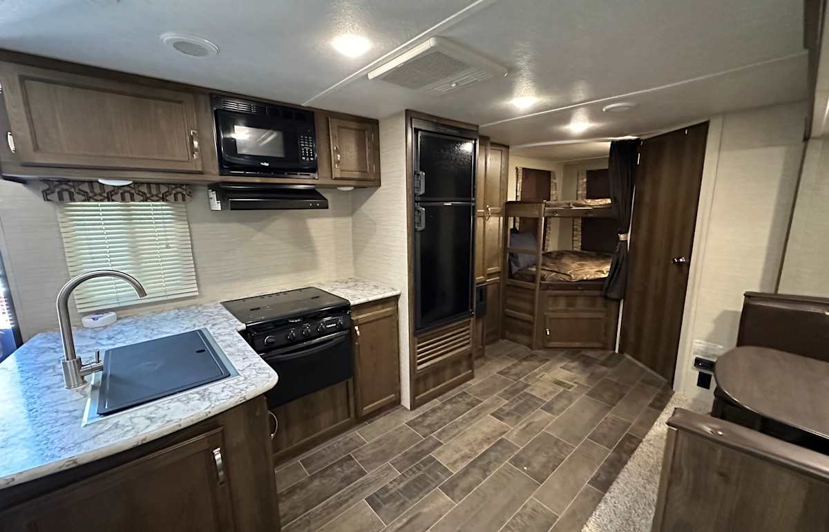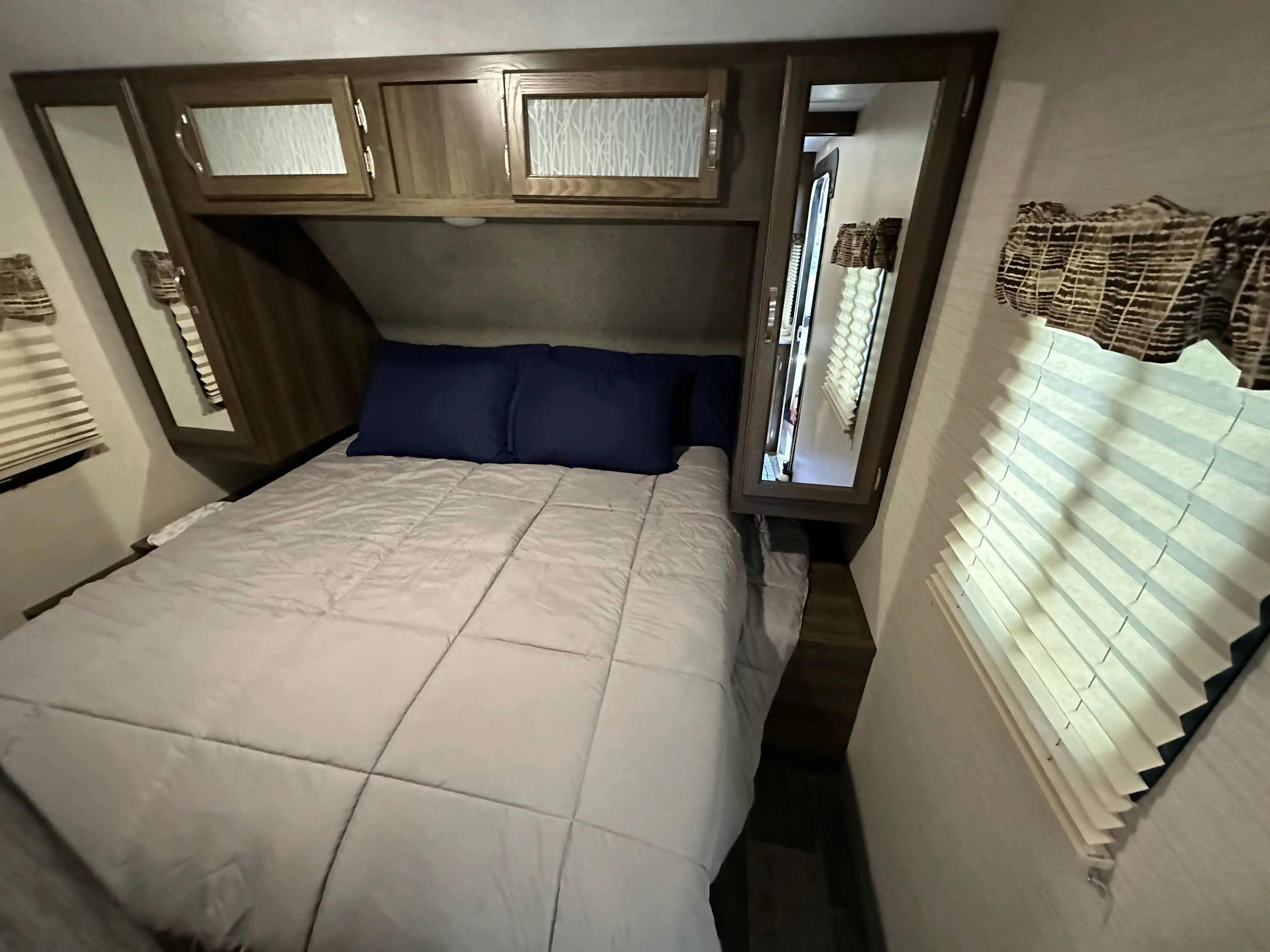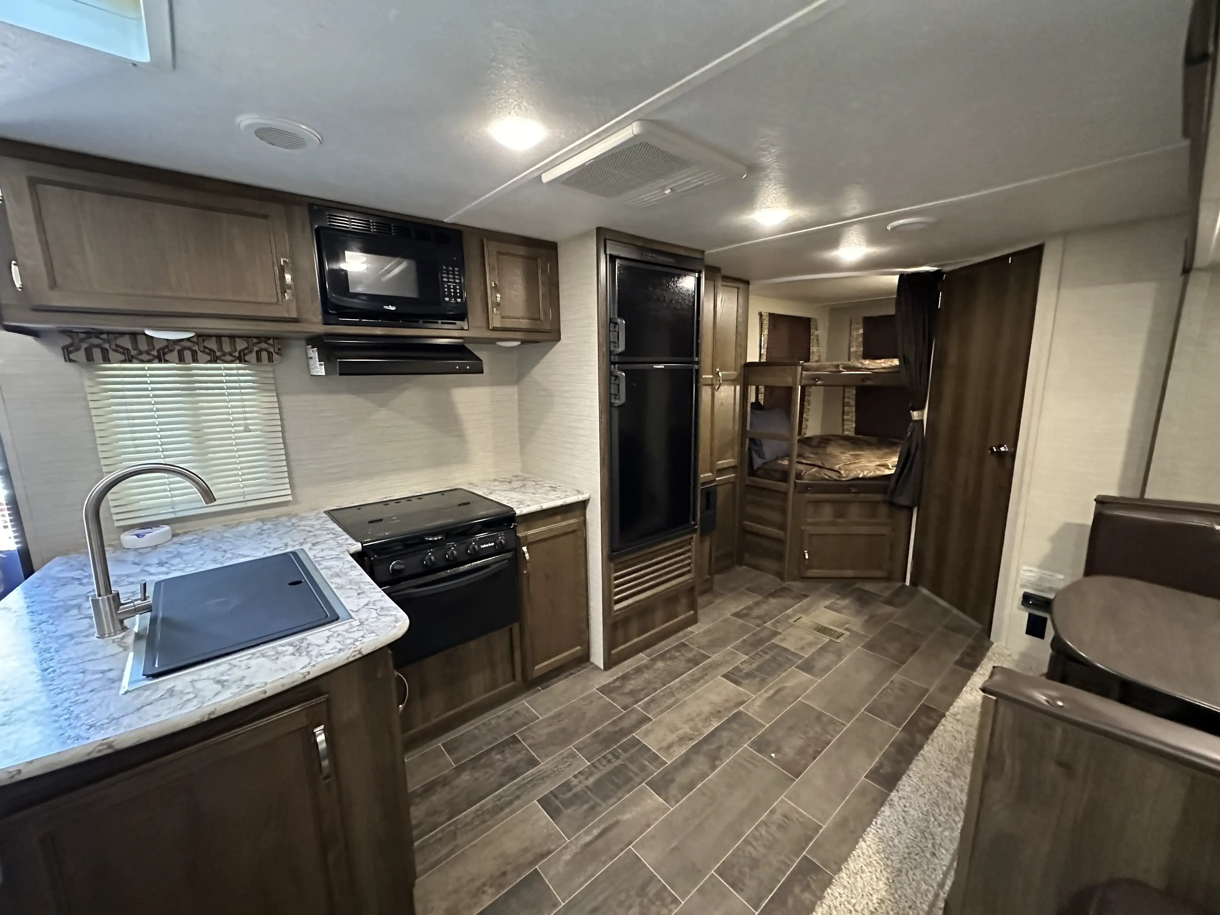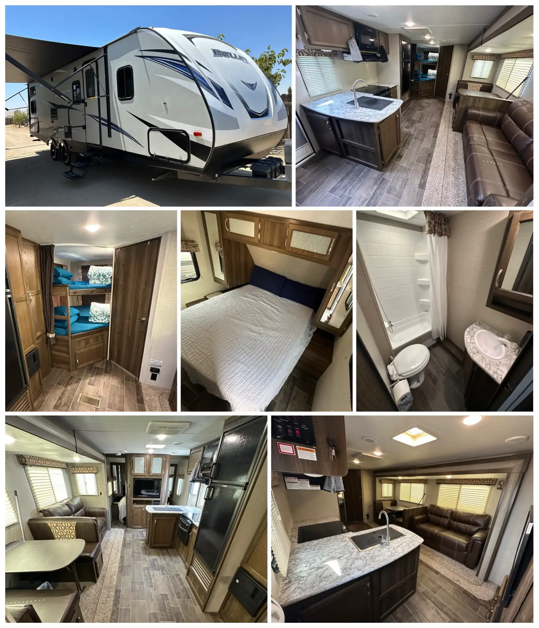The Bullet is perfect for making lifelong family memories! It has plenty of room to sleep 8-10 people. The master room has a queen size bed with a comfortable mattress topper. There are two large bunk beds with curtains for privacy. The booth dinette & couch both turn into a bed as well. The kitchen has a farmhouse style sink that has a top cover for additional counter space to utilize and a large pantry to store all of your food. This trailer also has a nice outdoor kitchen to make the time you spend outside of the trailer easier.