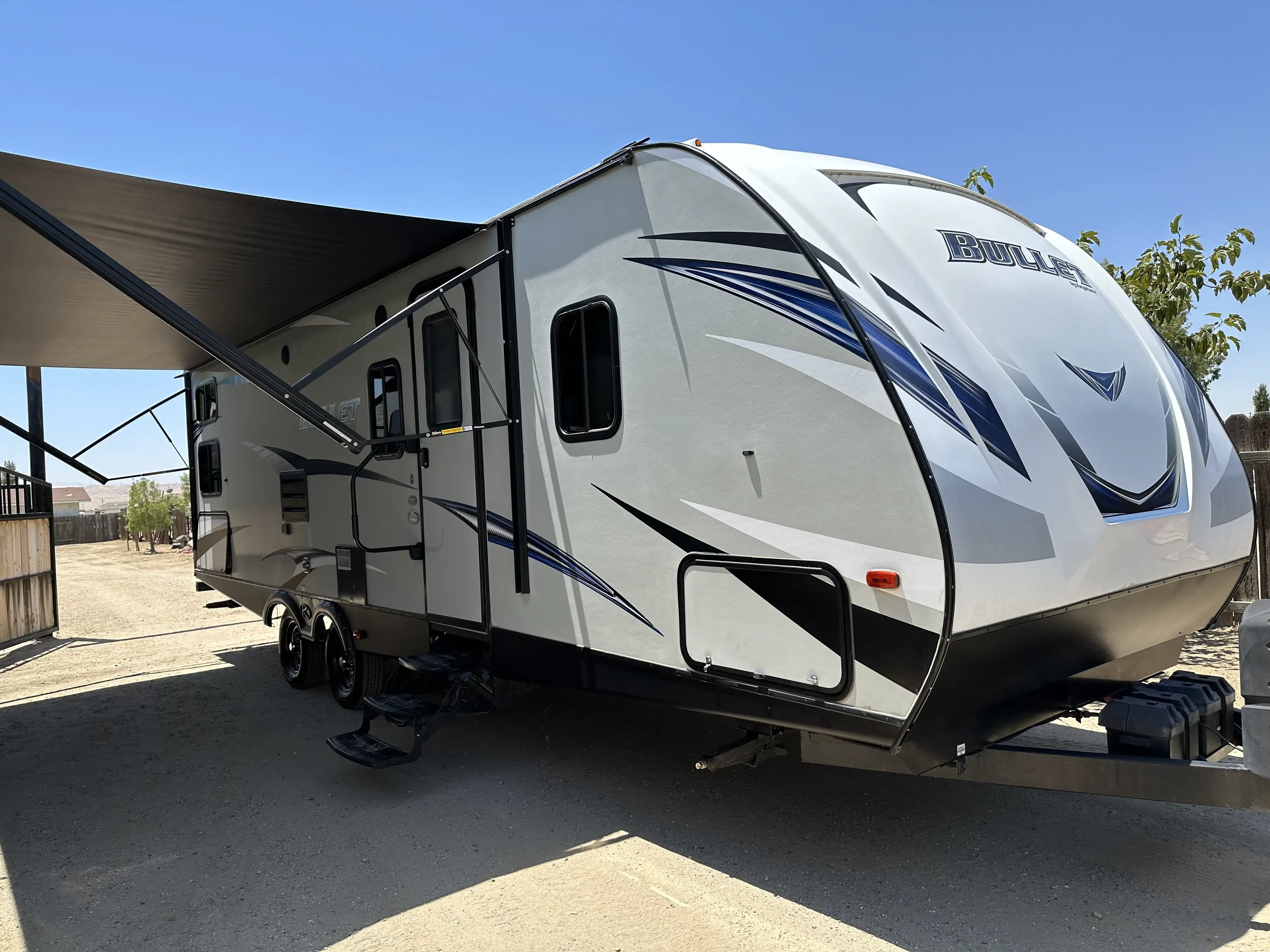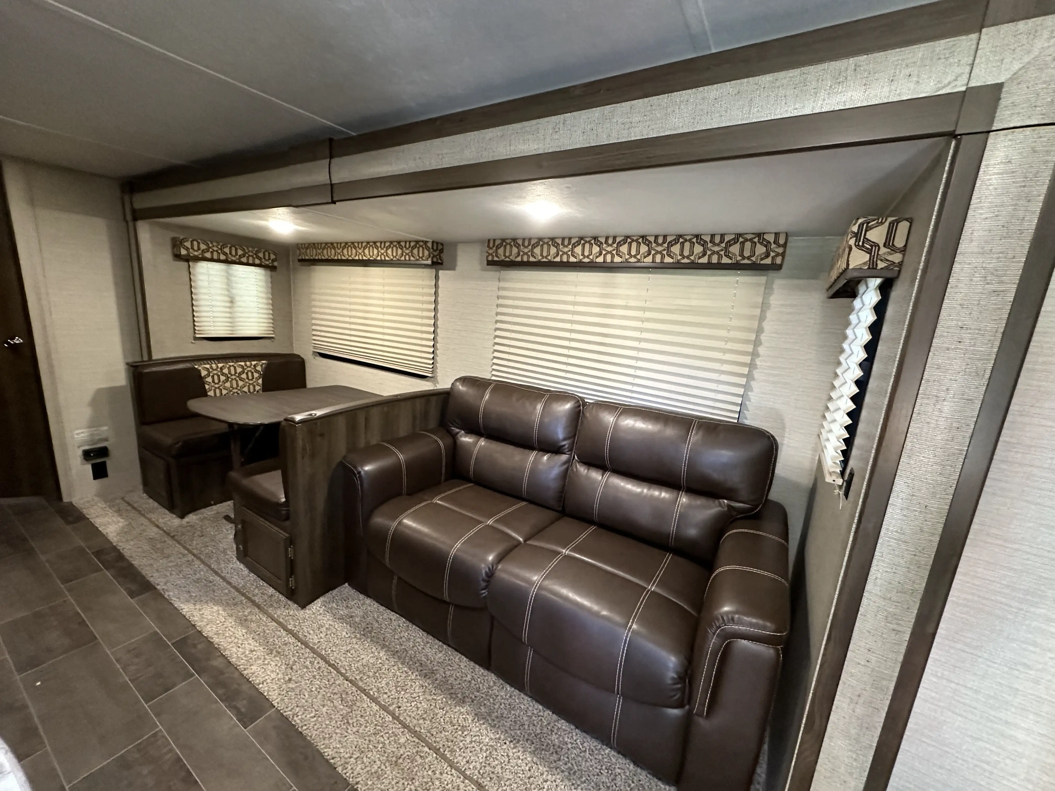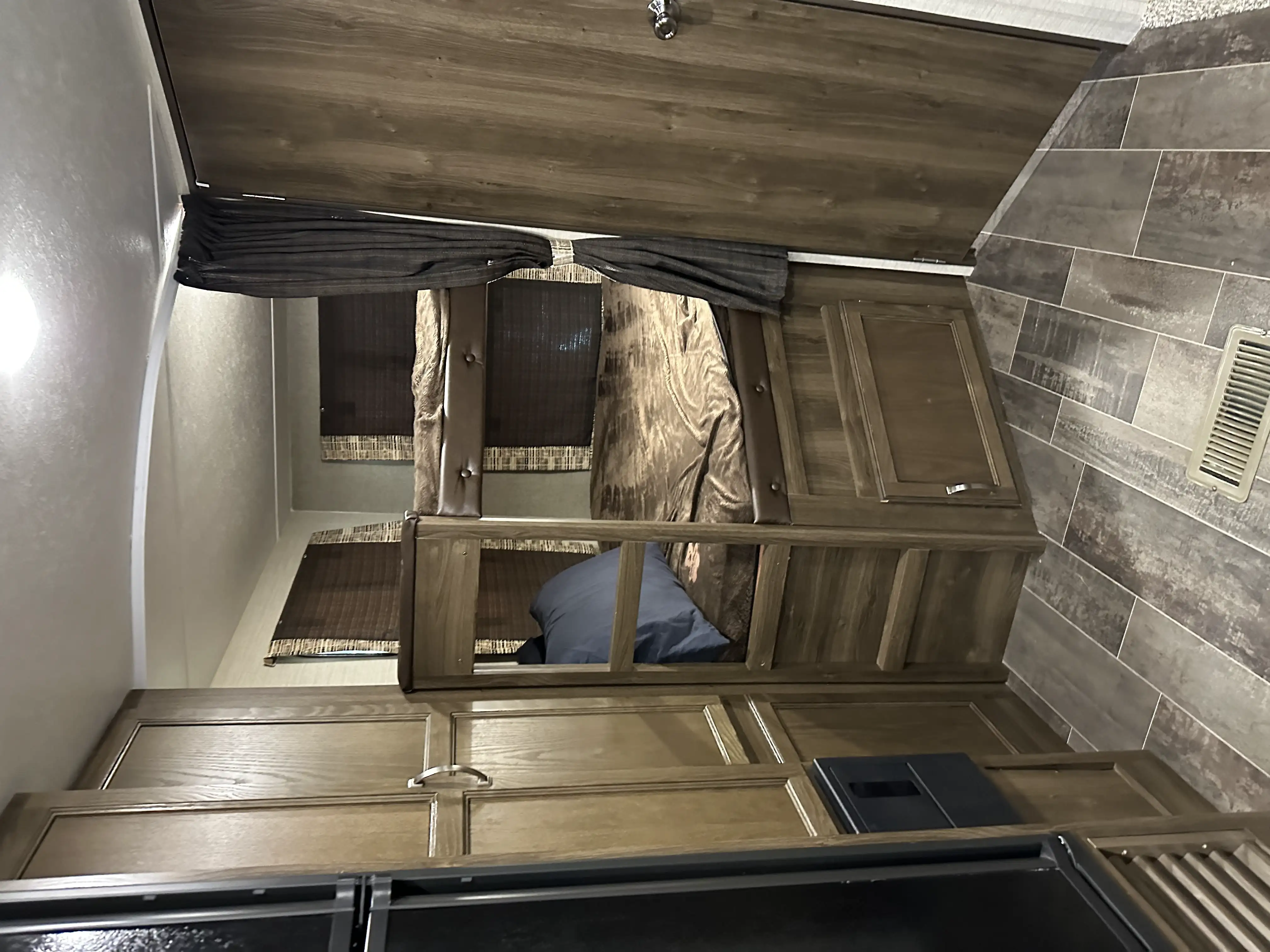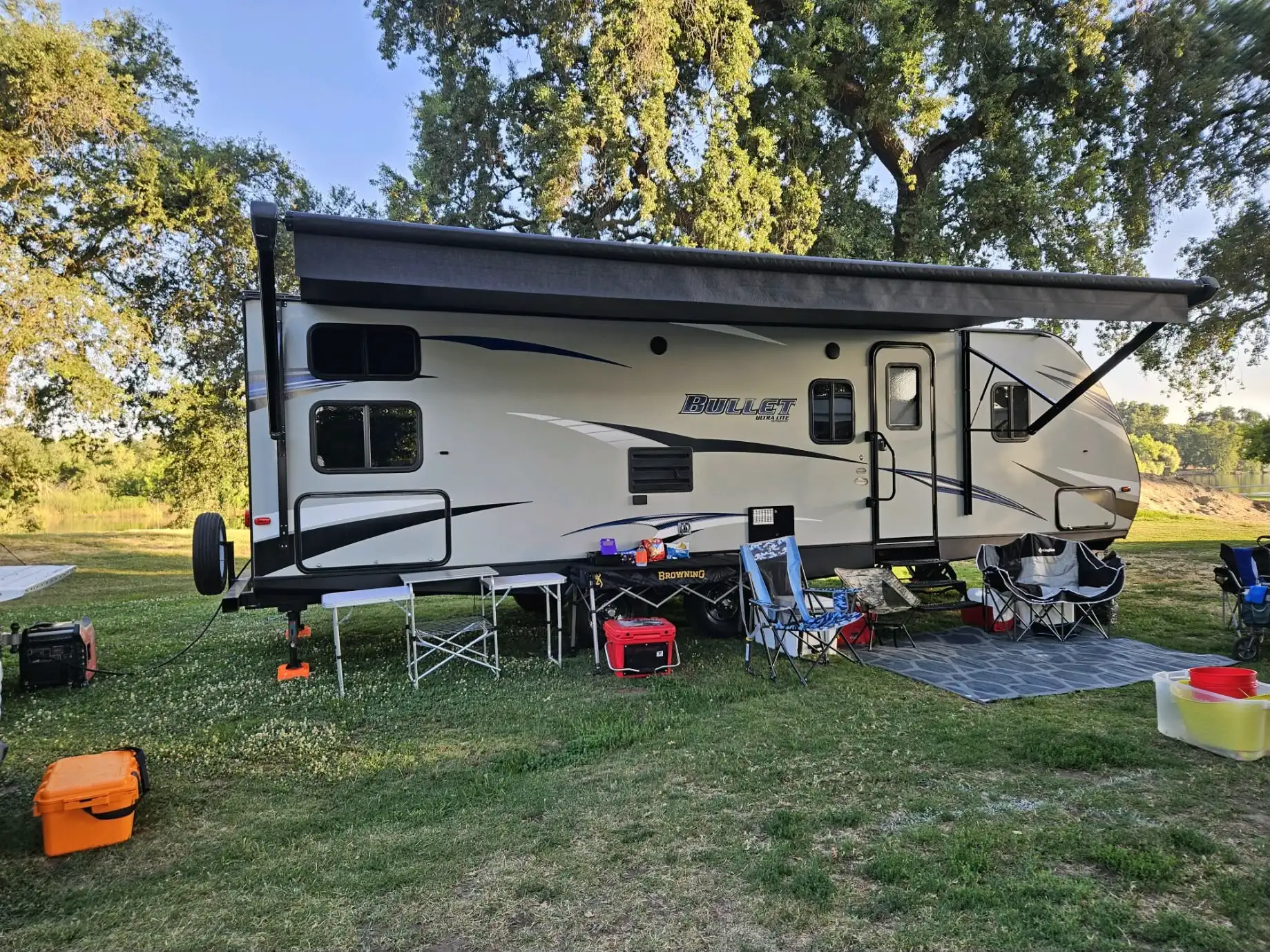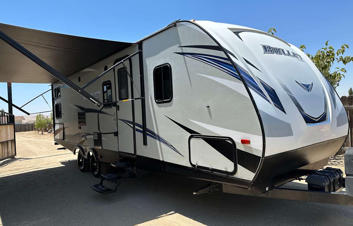 The Bullet is perfect for making lifelong family memories! It has plenty of room to sleep 8-10 people. The master room has a queen size bed with a comfortable mattress topper. There are two large bunk beds with curtains for privacy. The booth dinette & couch both turn into a bed as well. The kitchen has a farmhouse style sink that has a top cover for additional counter space to utilize and a large pantry to store all of your food. This trailer also has a nice outdoor kitchen to make the time you spend outside of the trailer easier.