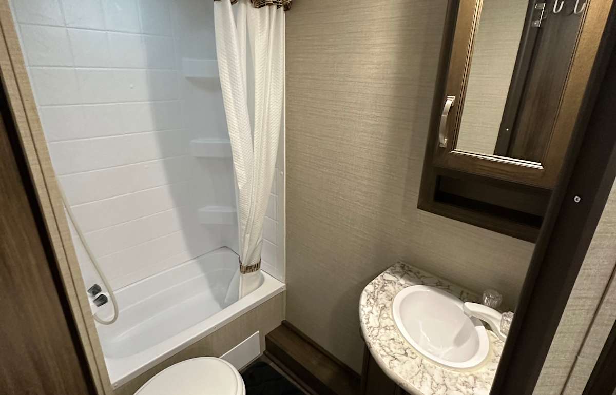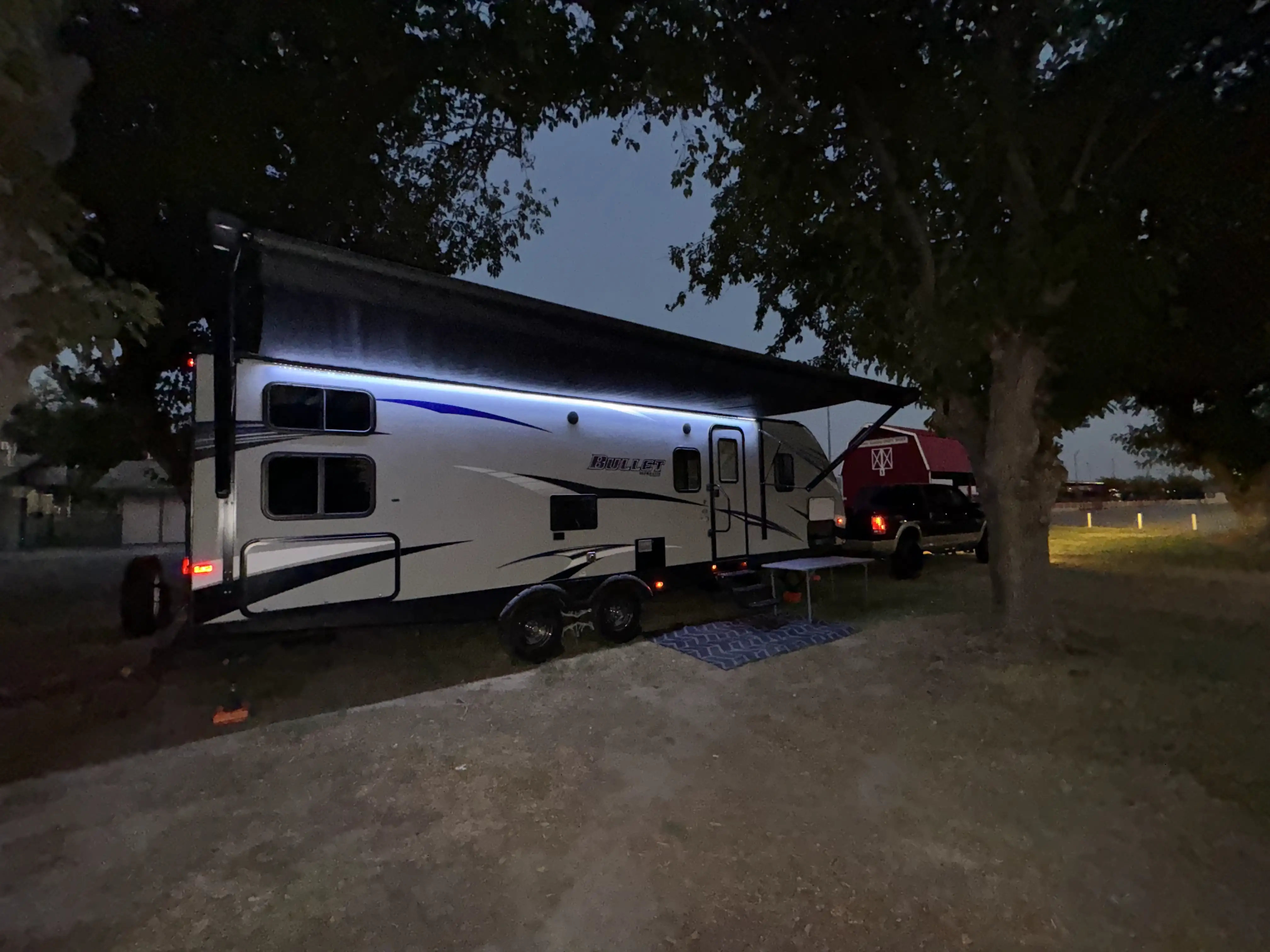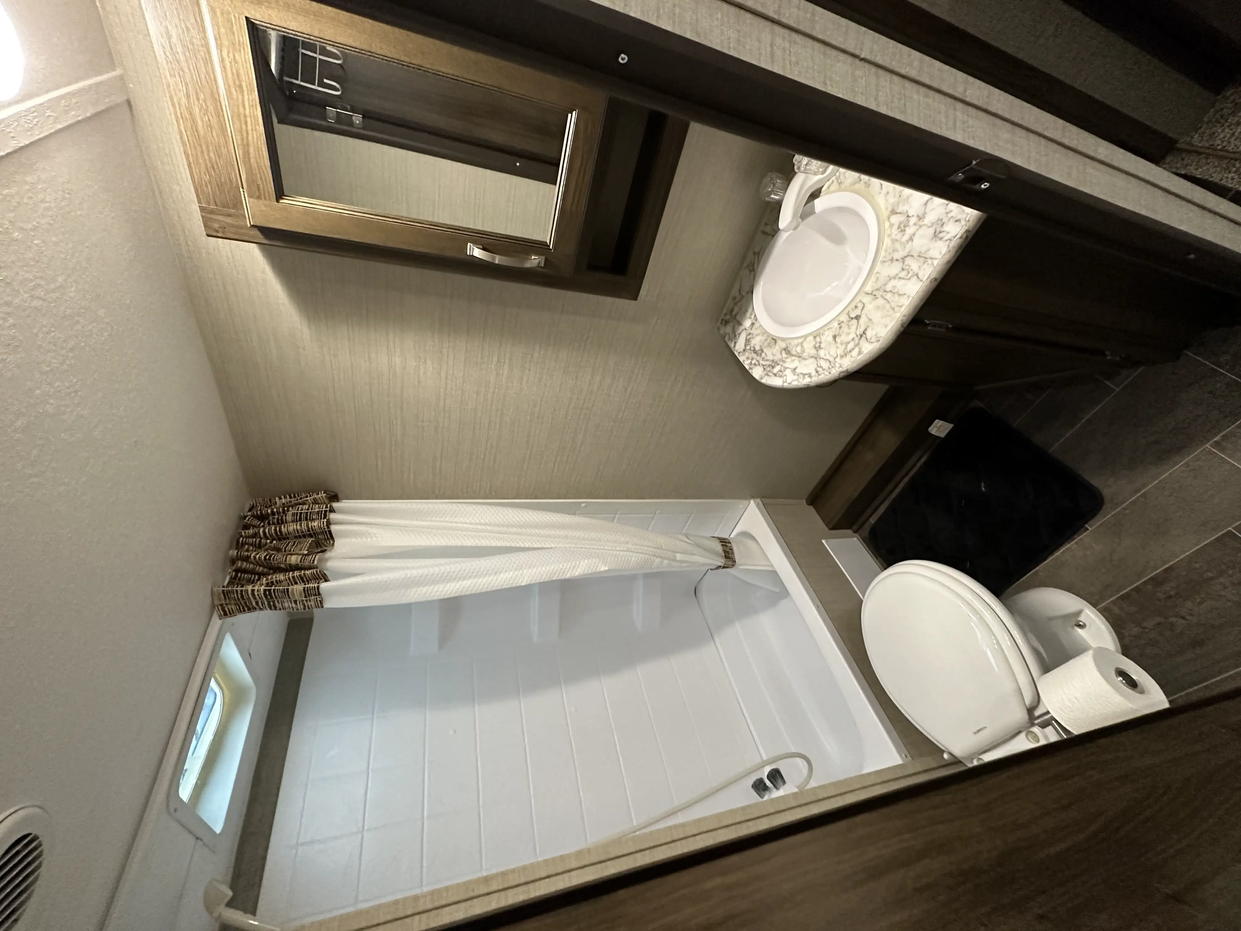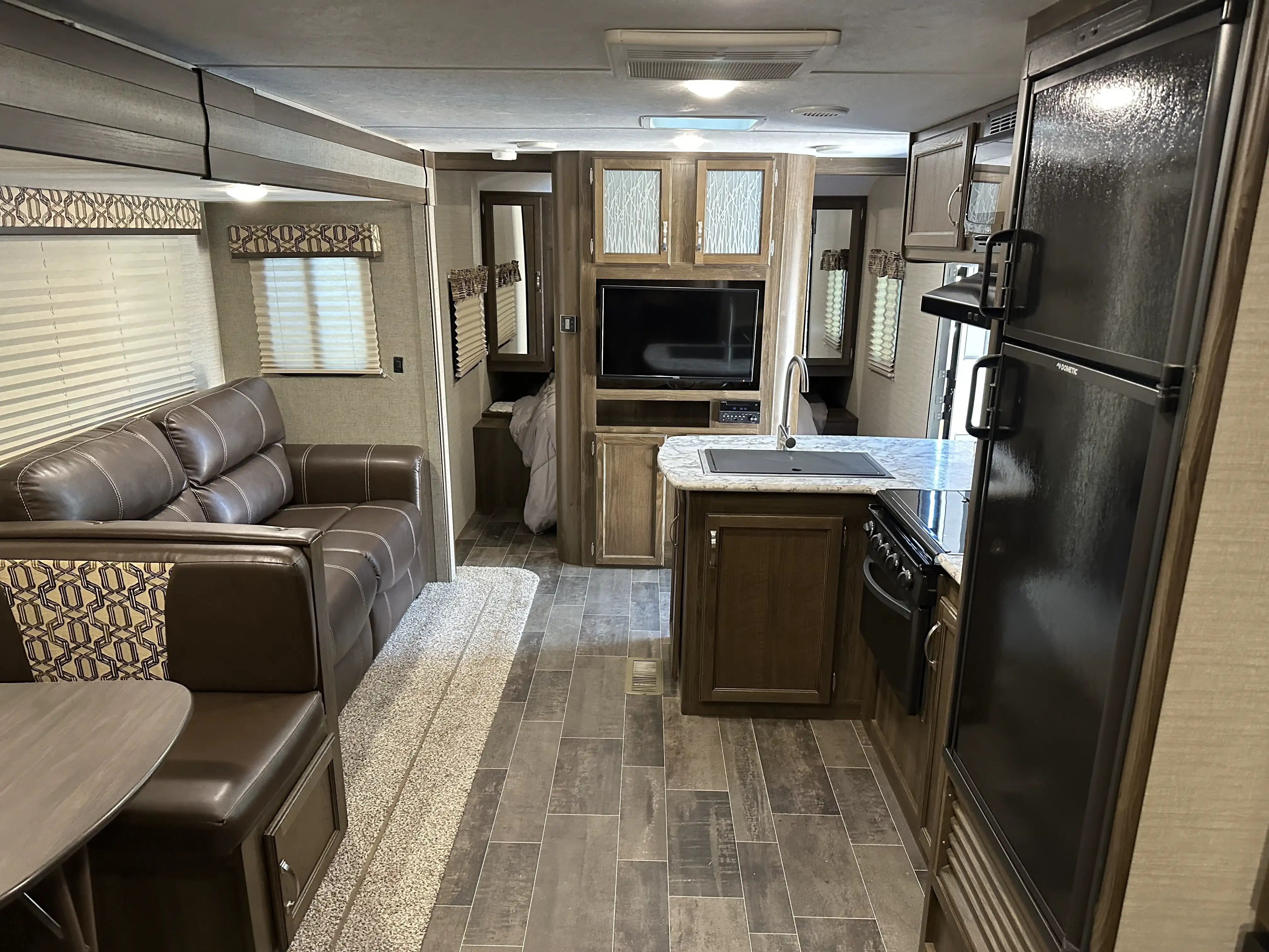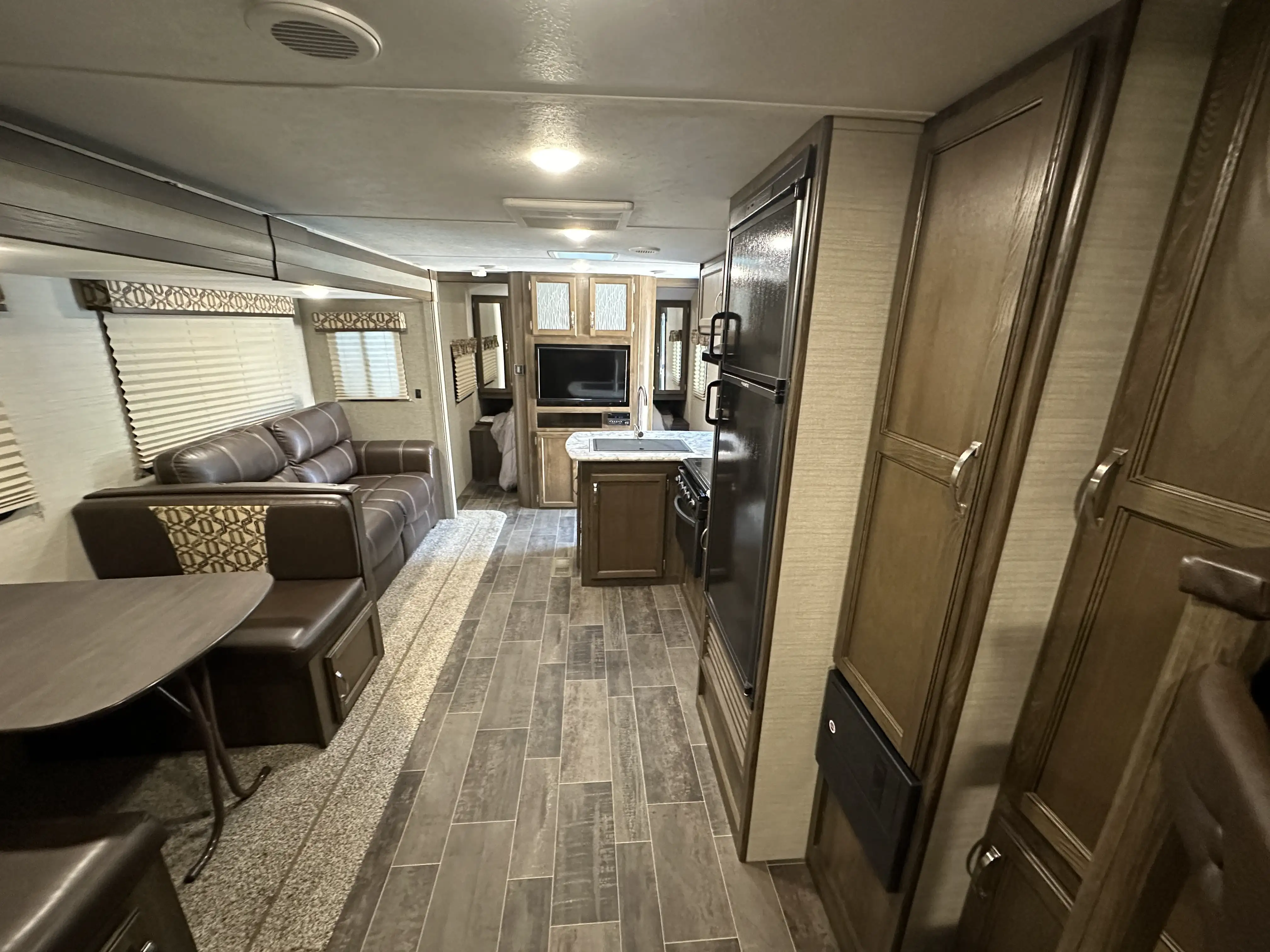 The Bullet is perfect for making lifelong family memories! It has plenty of room to sleep 8-10 people. The master room has a queen size bed with a comfortable mattress topper. There are two large bunk beds with curtains for privacy. The booth dinette & couch both turn into a bed as well. The kitchen has a farmhouse style sink that has a top cover for additional counter space to utilize and a large pantry to store all of your food. This trailer also has a nice outdoor kitchen to make the time you spend outside of the trailer easier.
