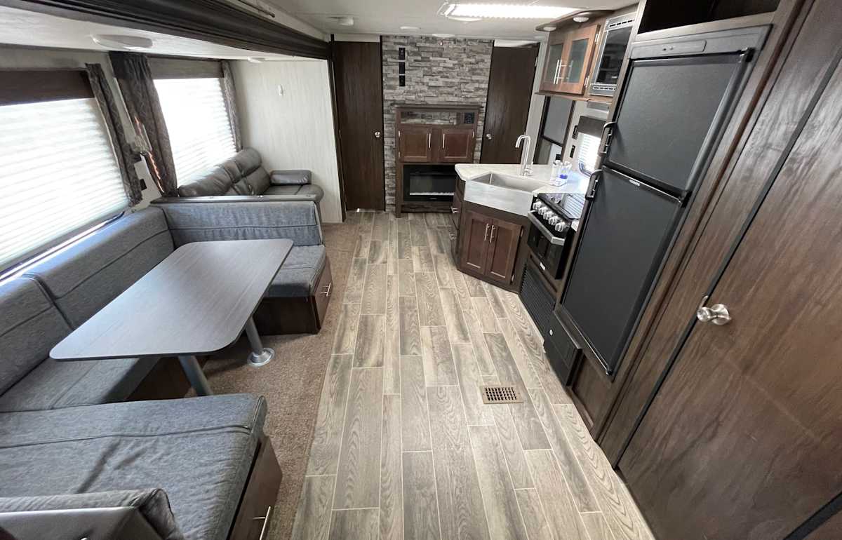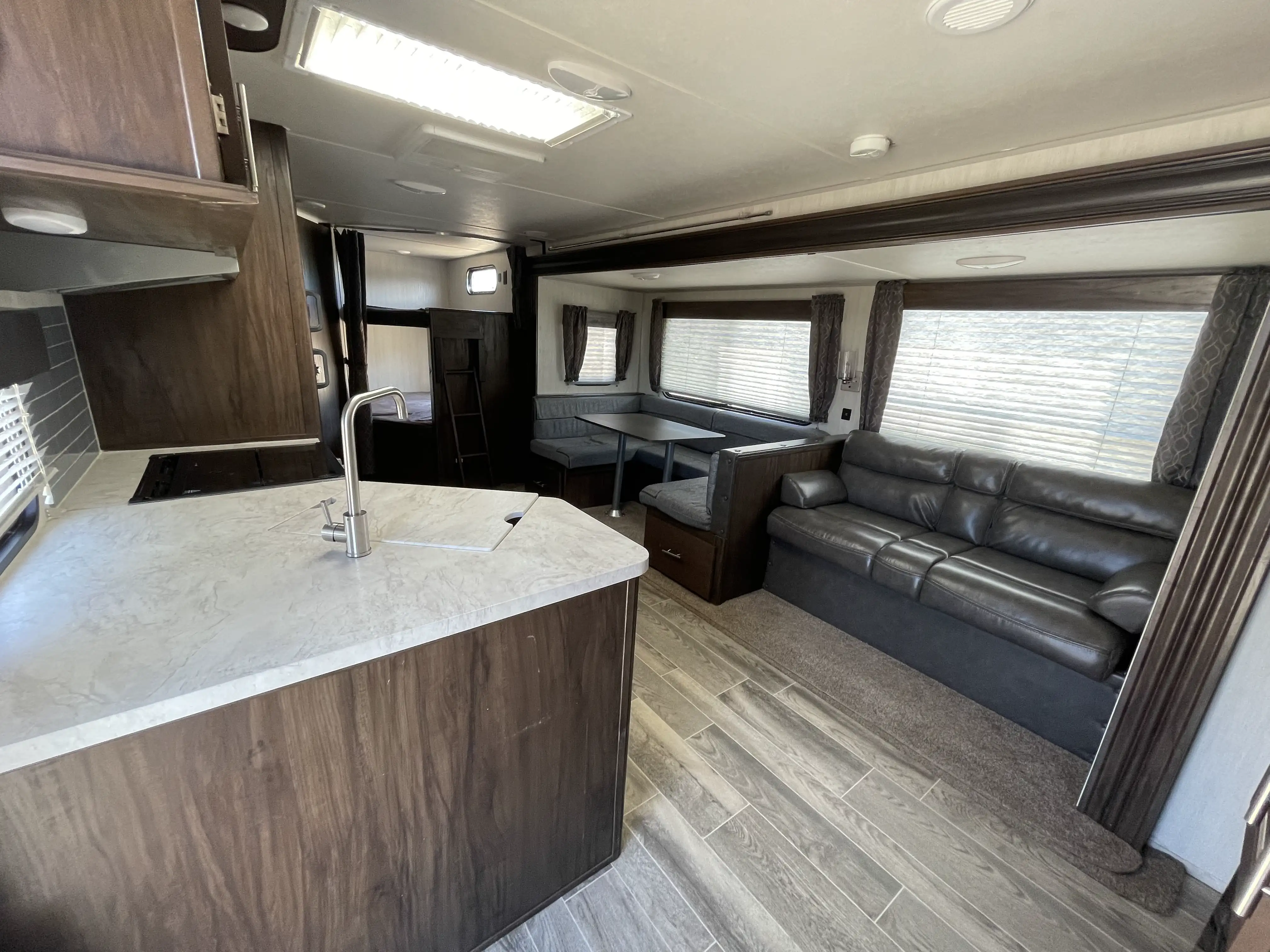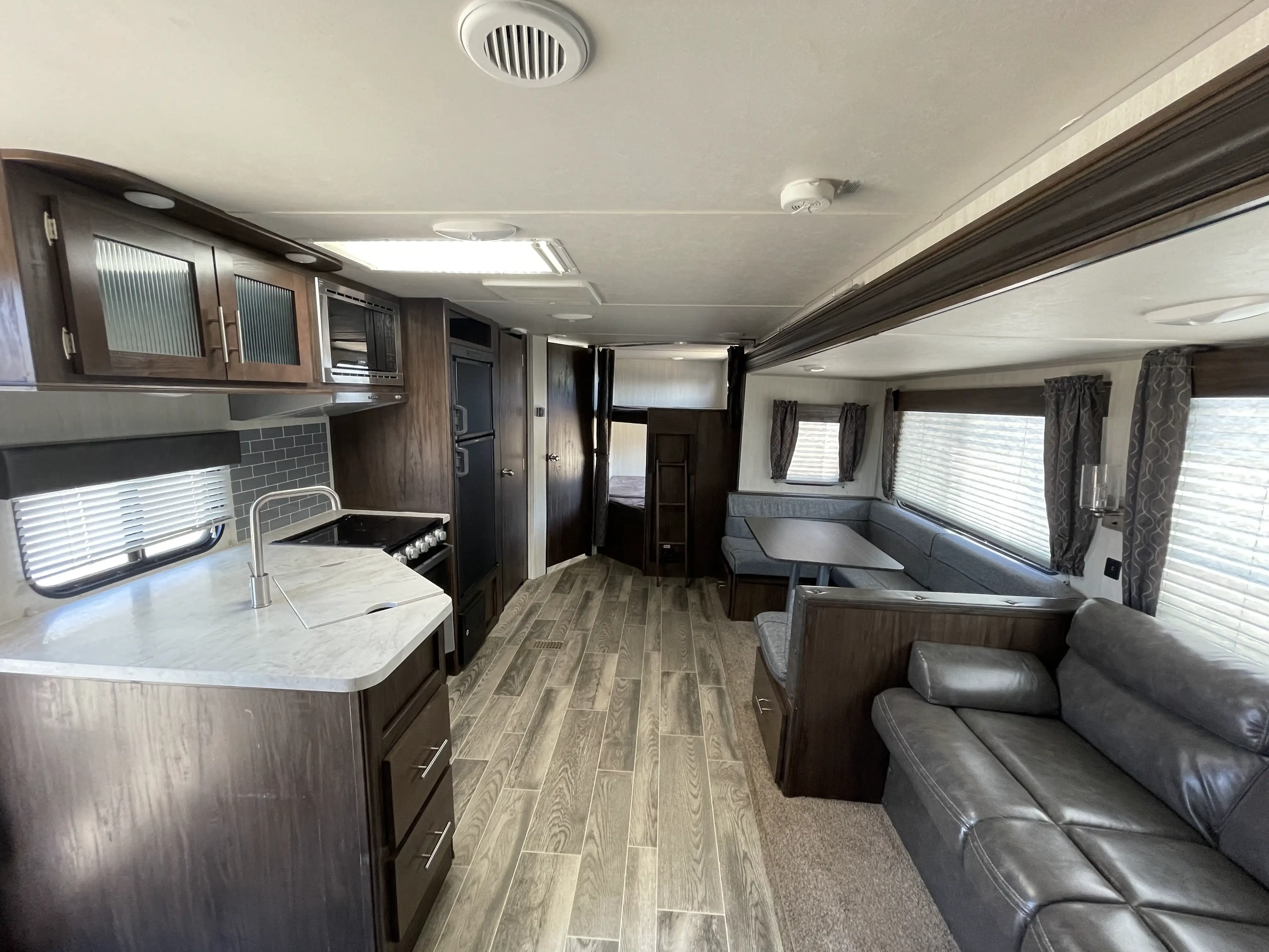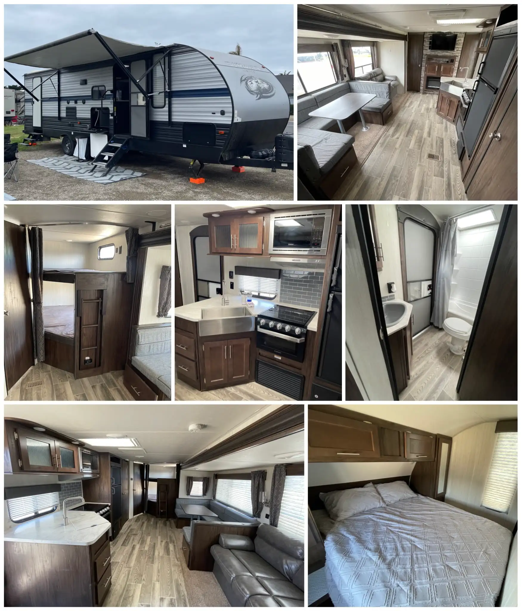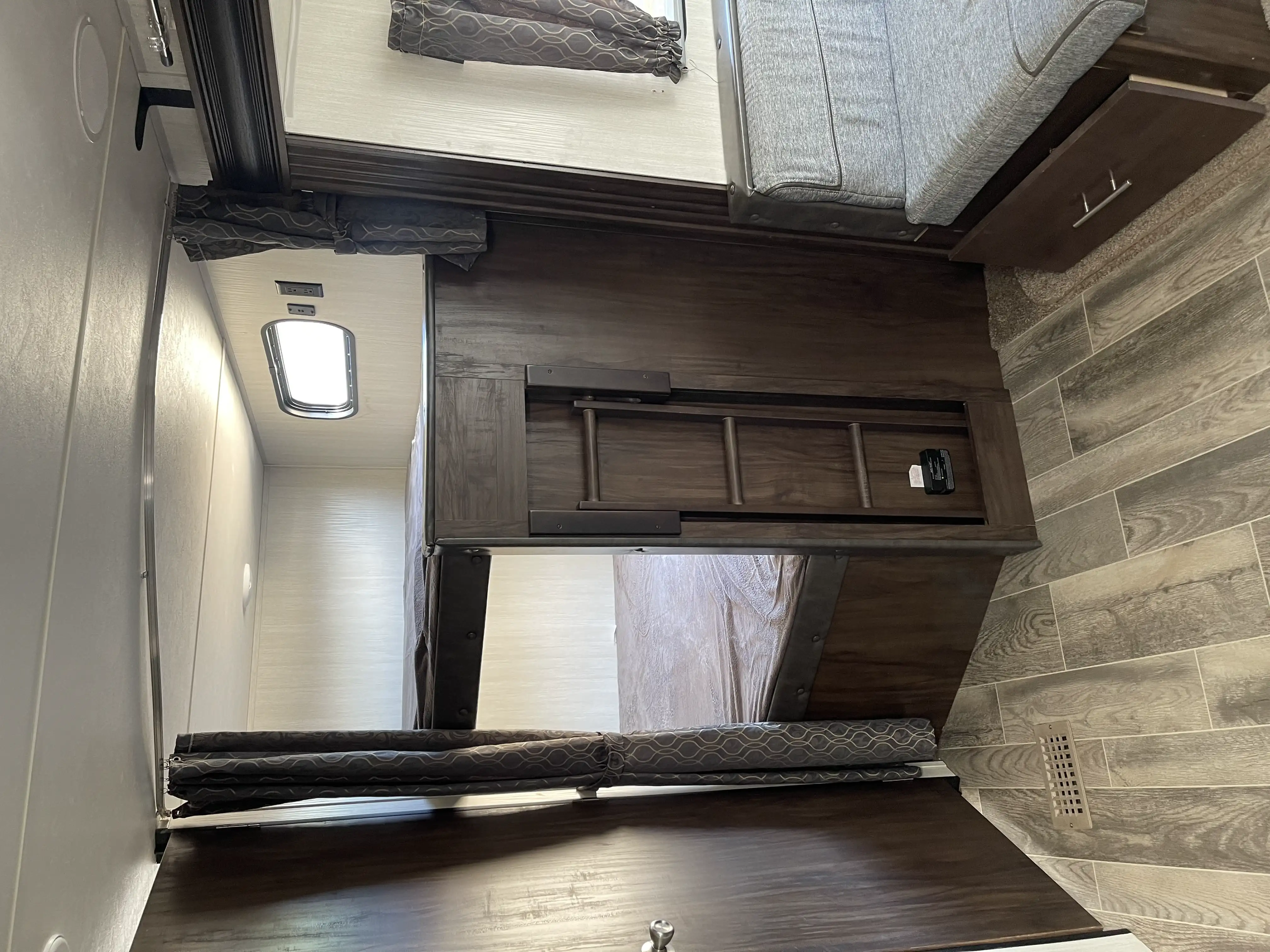 The Cherokee is perfect for making lifelong family memories! It has plenty of room to sleep 8-10 people. The master room has a queen size bed with a comfortable mattress topper. There are two large bunk beds with curtains for privacy. The booth dinette & couch both turn into a bed as well. The kitchen has a farmhouse style sink that has a top cover for additional counter space to utilize and a large pantry to store all of your food. This trailer also has a nice outdoor kitchen to make the time you spend outside of the trailer easier.