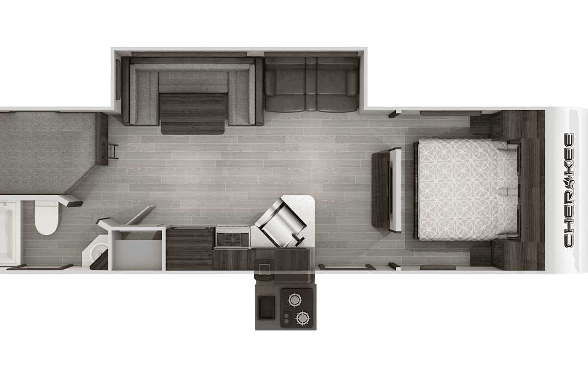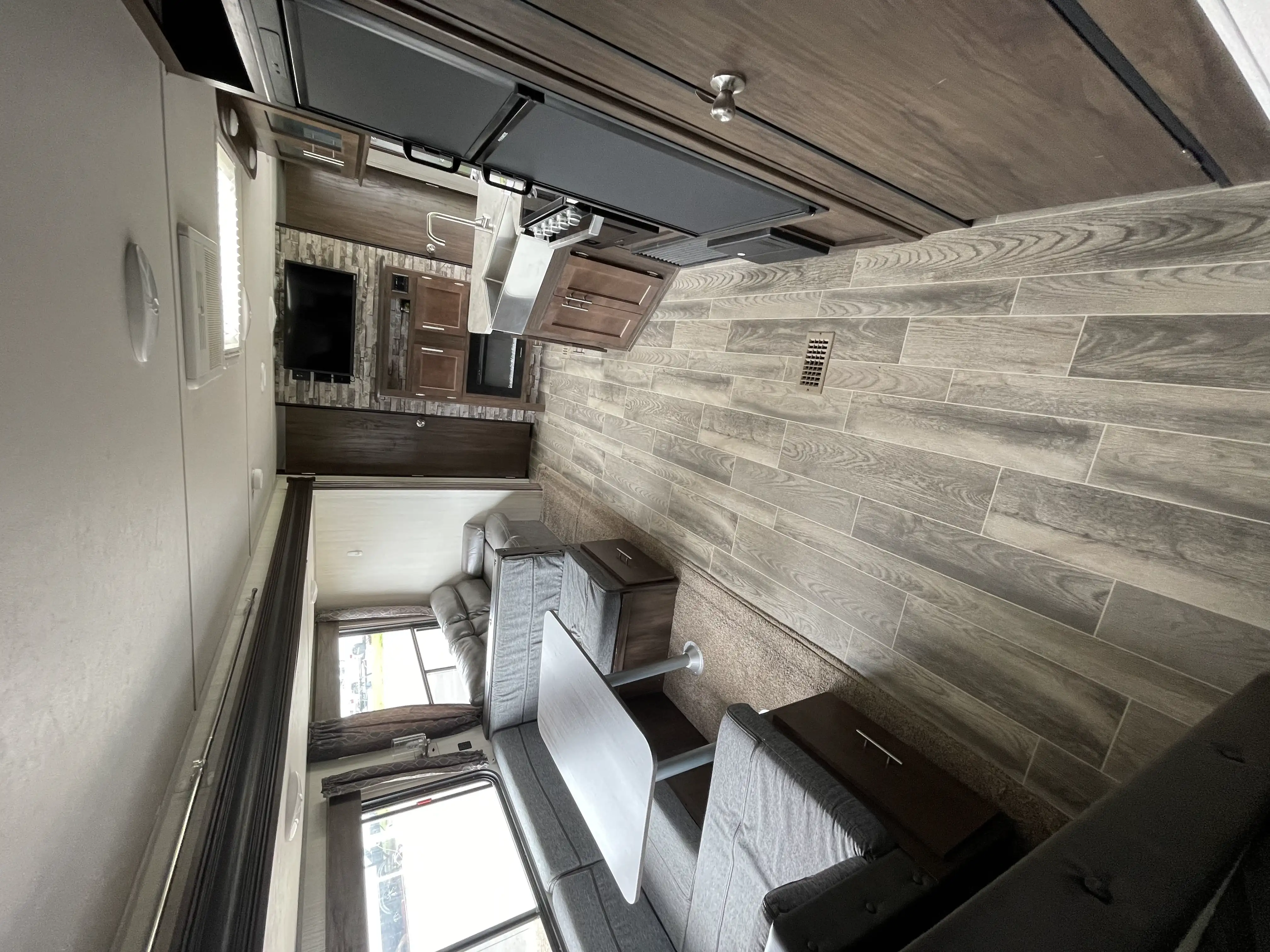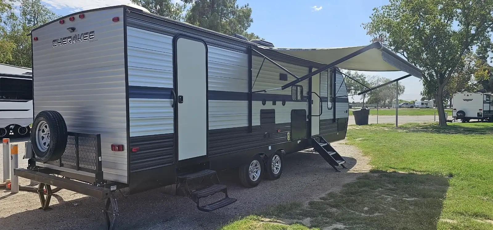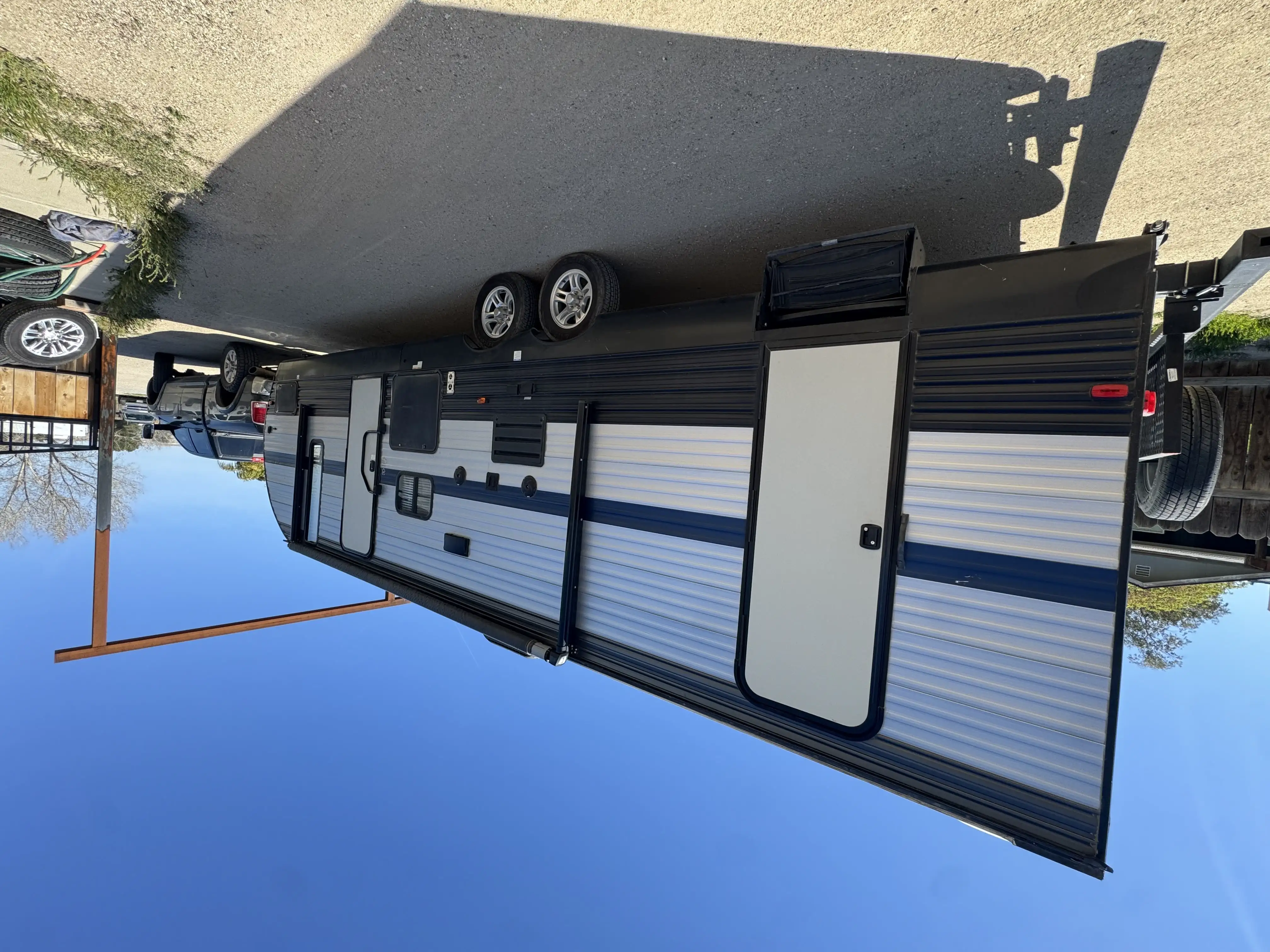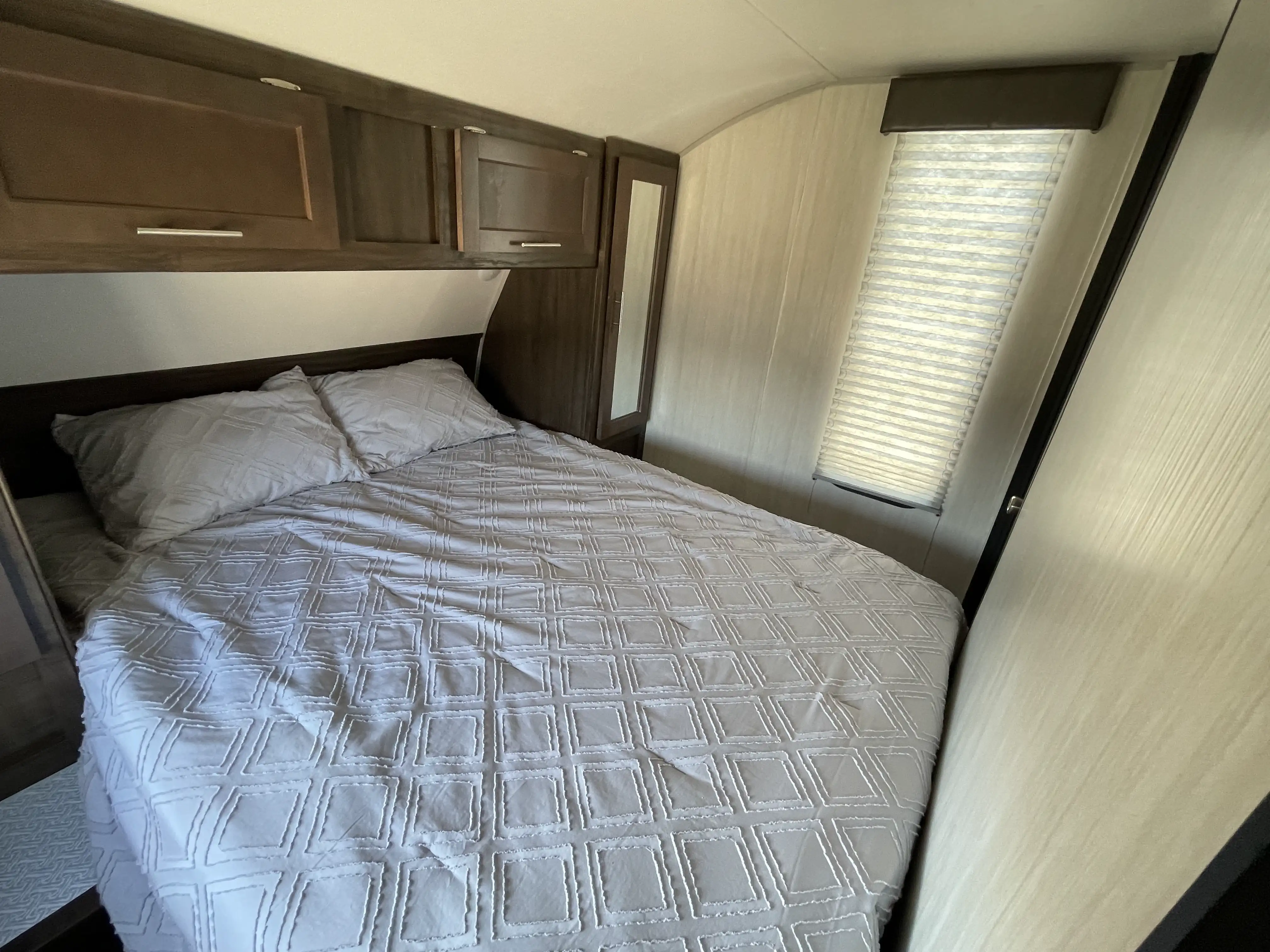 The Cherokee is perfect for making lifelong family memories! It has plenty of room to sleep 8-10 people. The master room has a queen size bed with a comfortable mattress topper. There are two large bunk beds with curtains for privacy. The booth dinette & couch both turn into a bed as well. The kitchen has a farmhouse style sink that has a top cover for additional counter space to utilize and a large pantry to store all of your food. This trailer also has a nice outdoor kitchen to make the time you spend outside of the trailer easier.