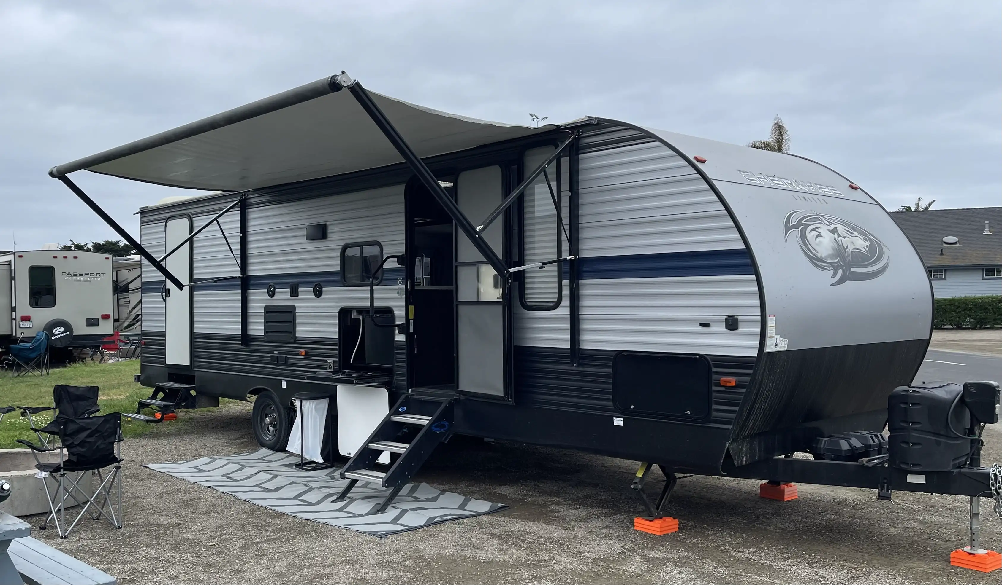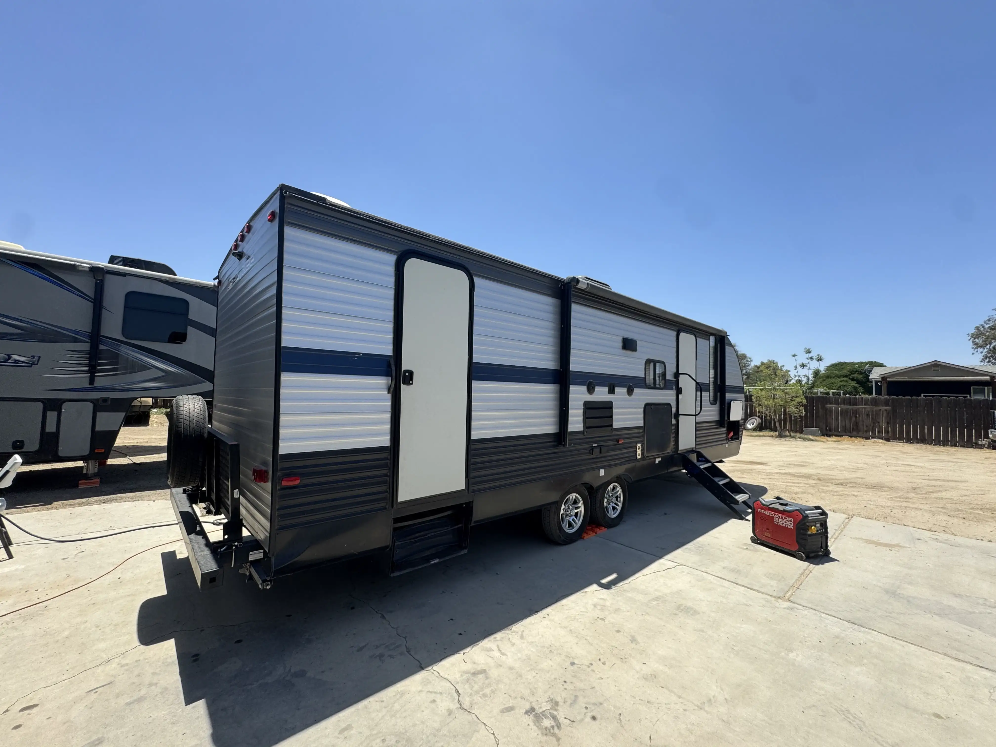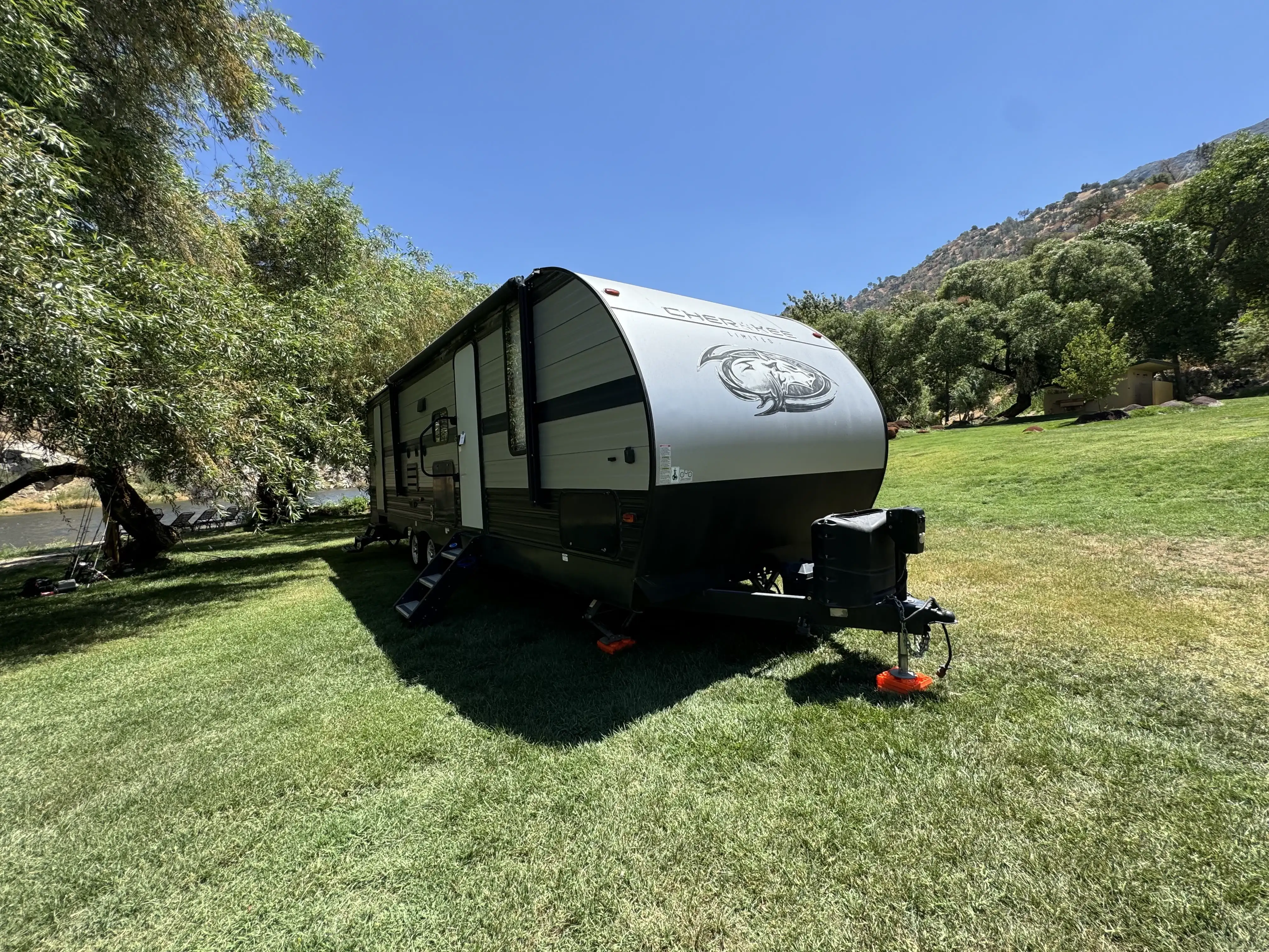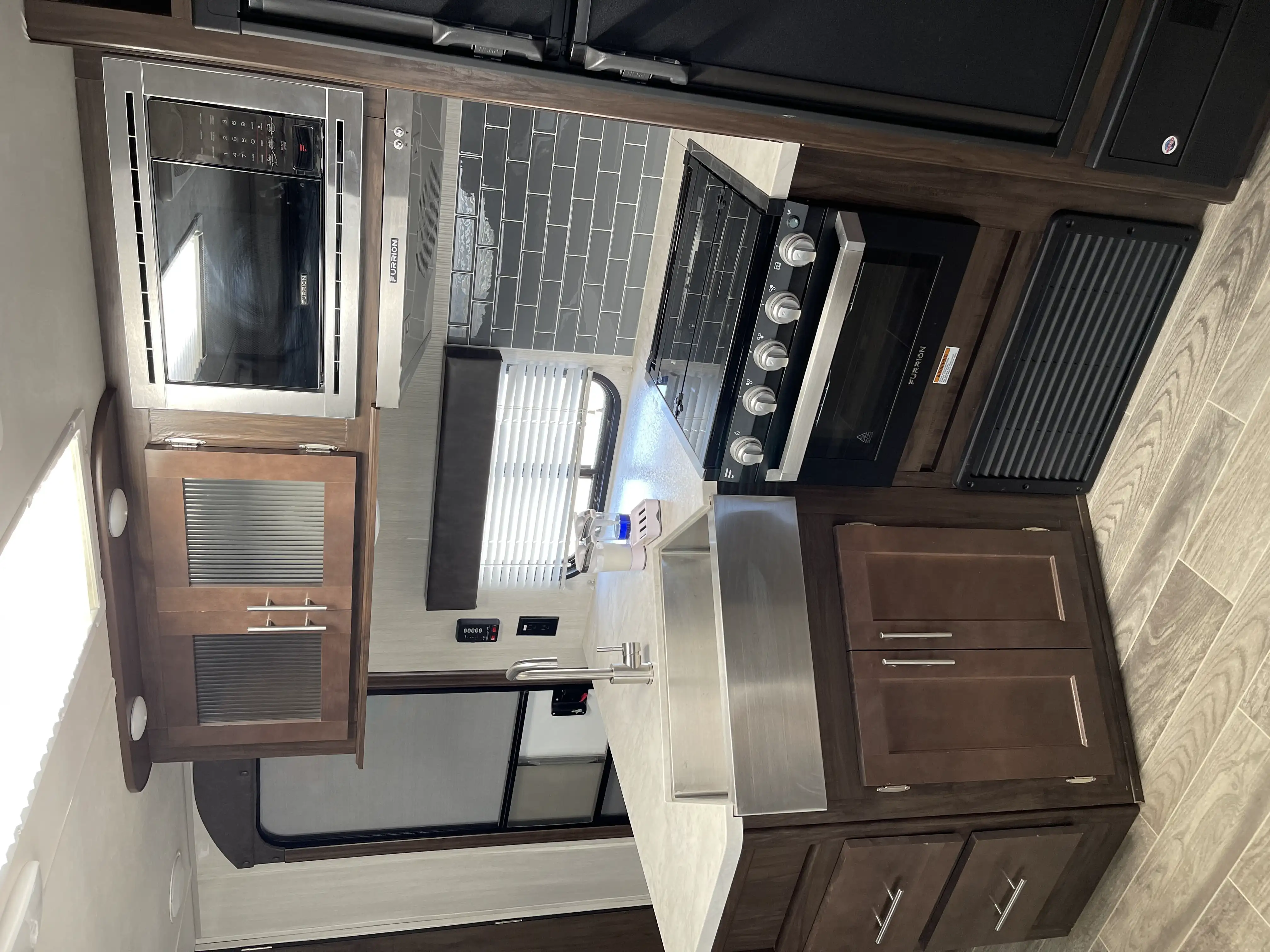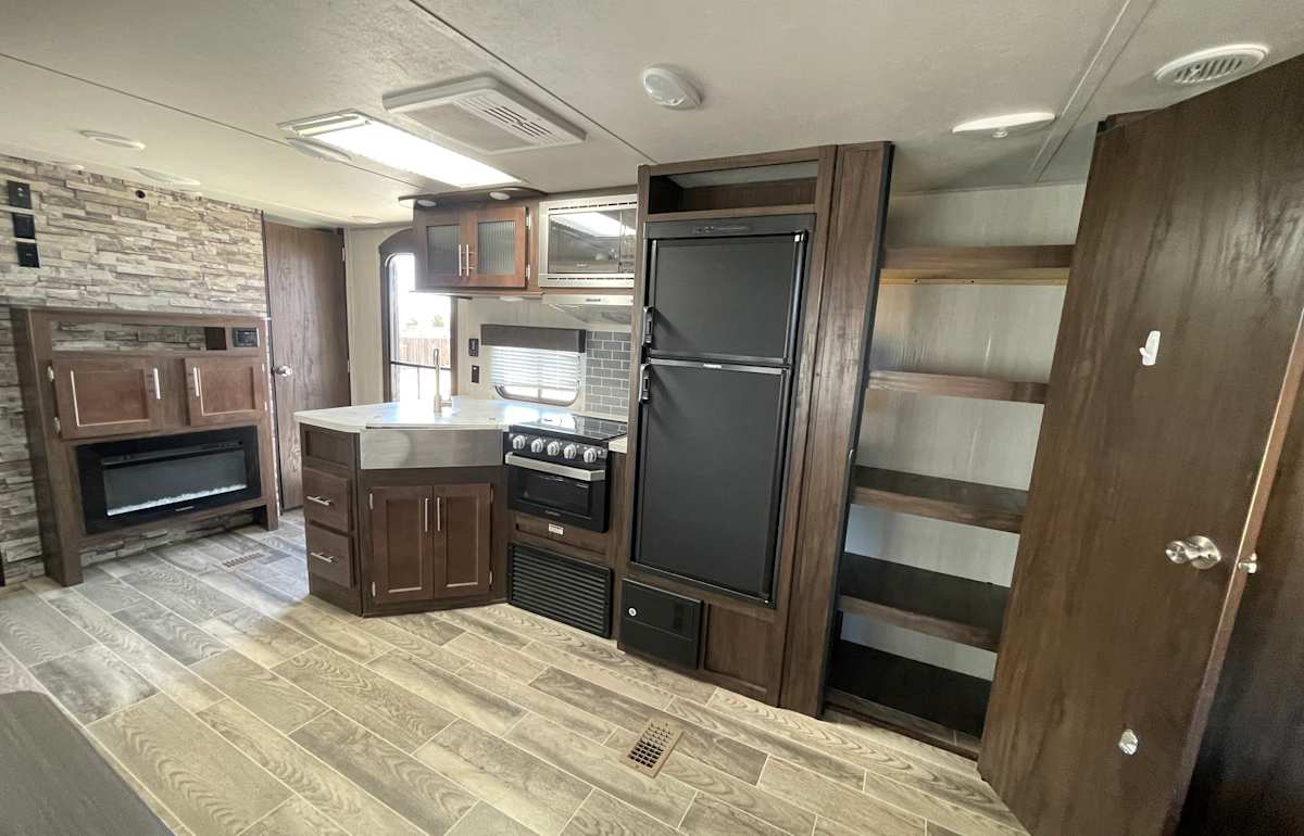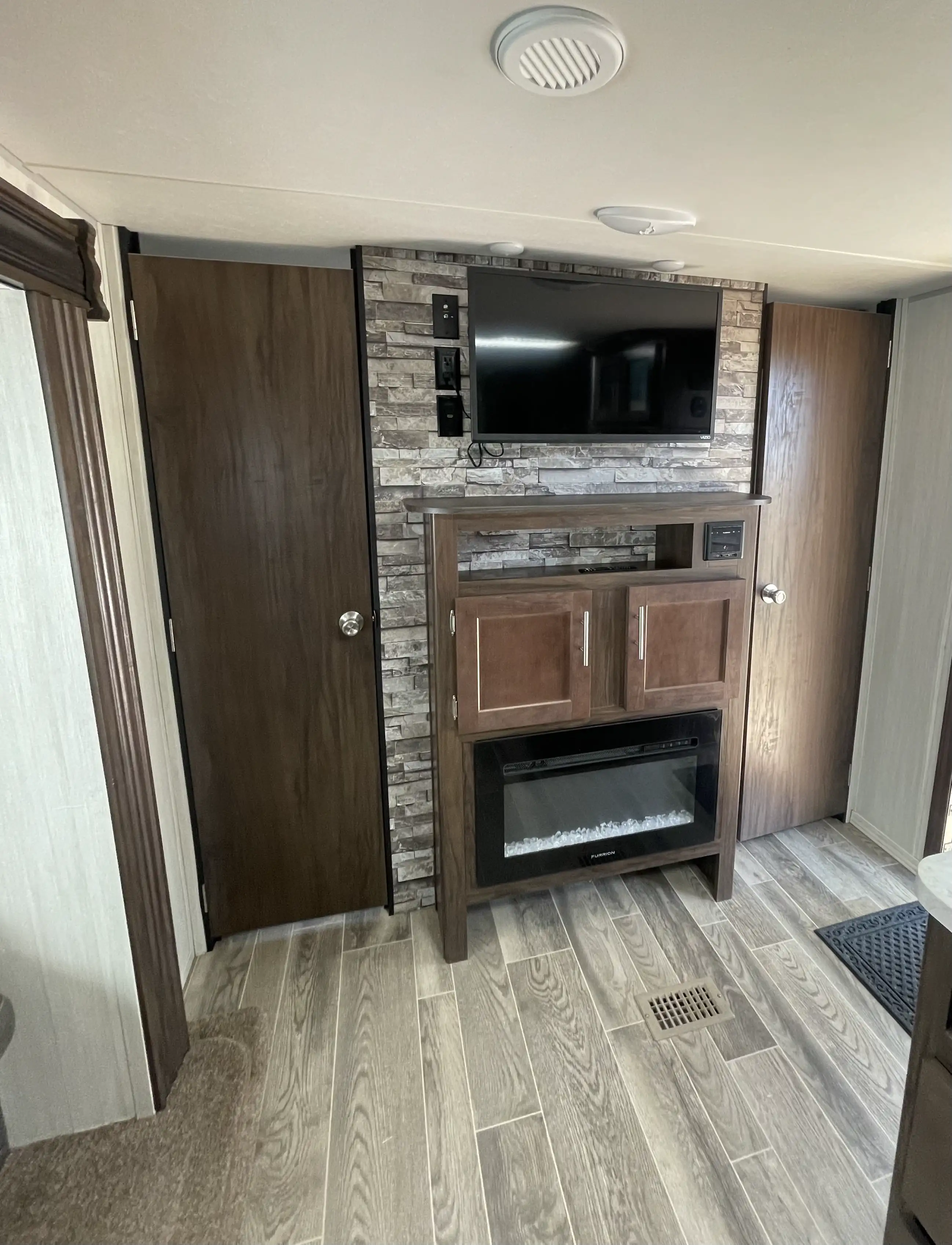 The Cherokee is perfect for making lifelong family memories! It has plenty of room to sleep 8-10 people. The master room has a queen size bed with a comfortable mattress topper. There are two large bunk beds with curtains for privacy. The booth dinette & couch both turn into a bed as well. The kitchen has a farmhouse style sink that has a top cover for additional counter space to utilize and a large pantry to store all of your food. This trailer also has a nice outdoor kitchen to make the time you spend outside of the trailer easier.
