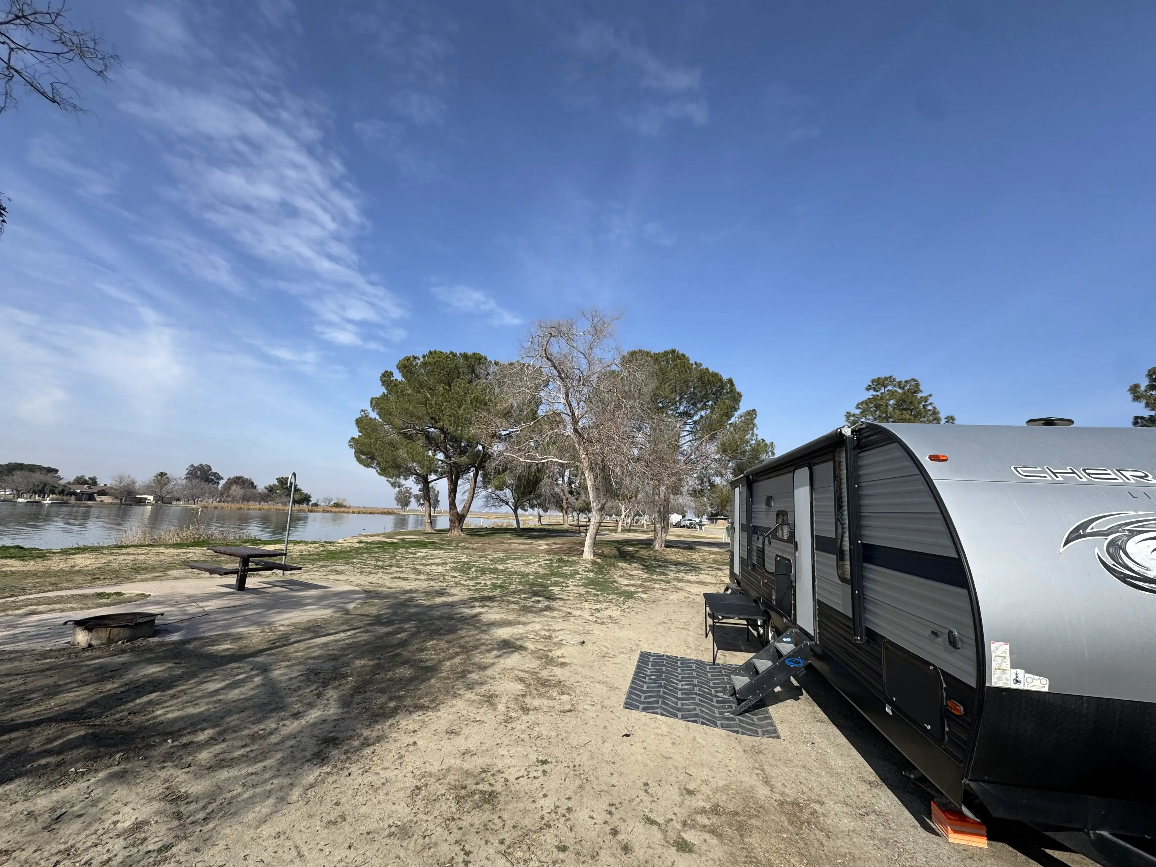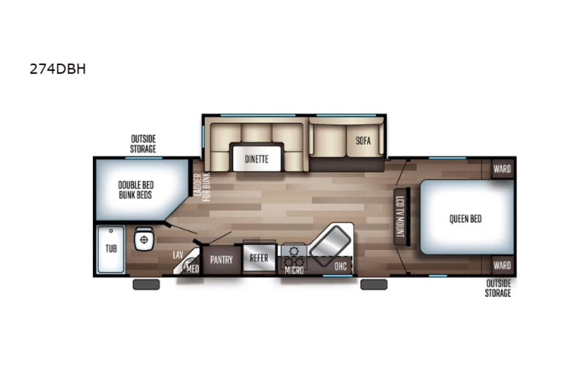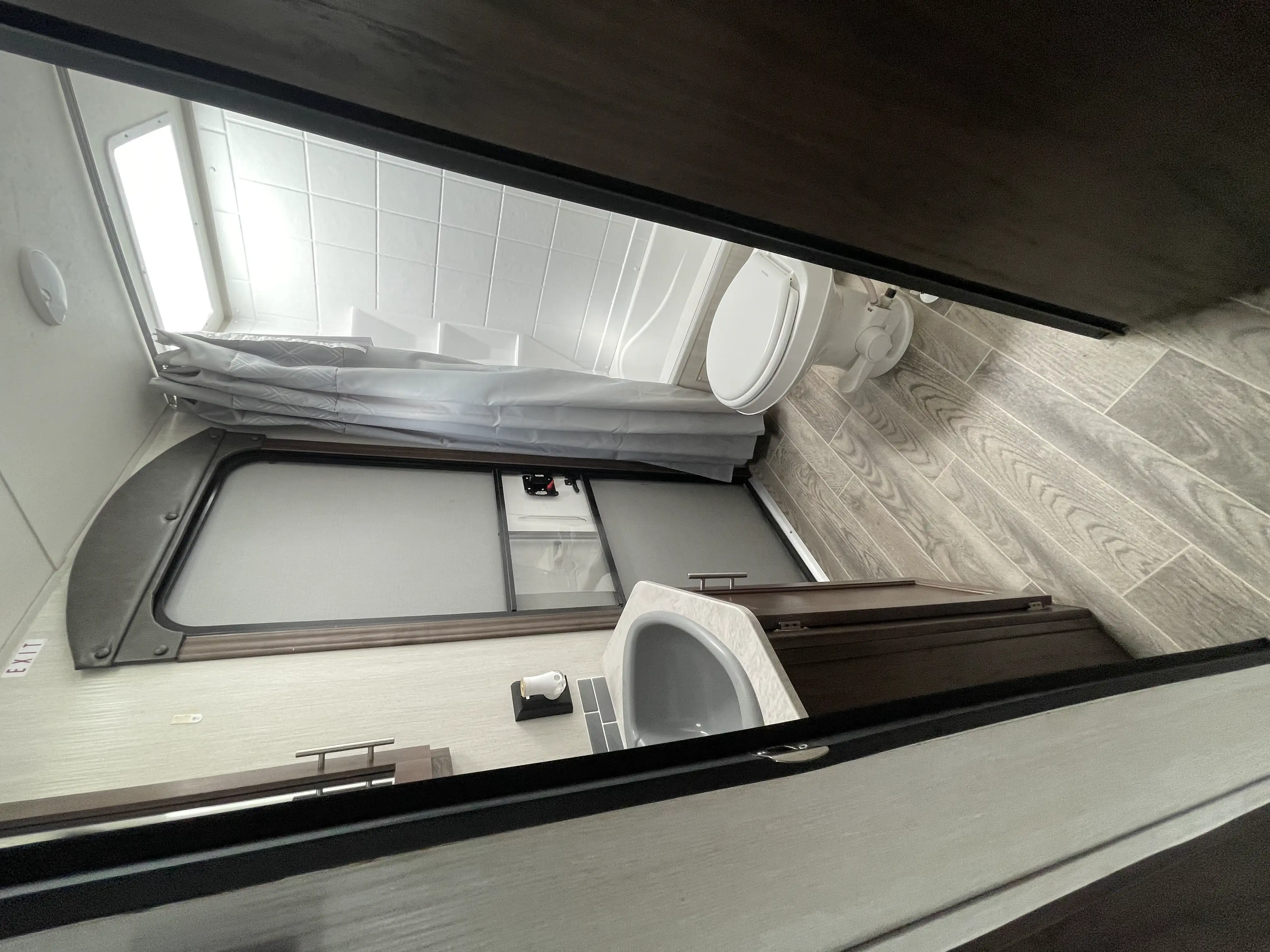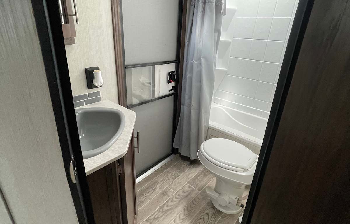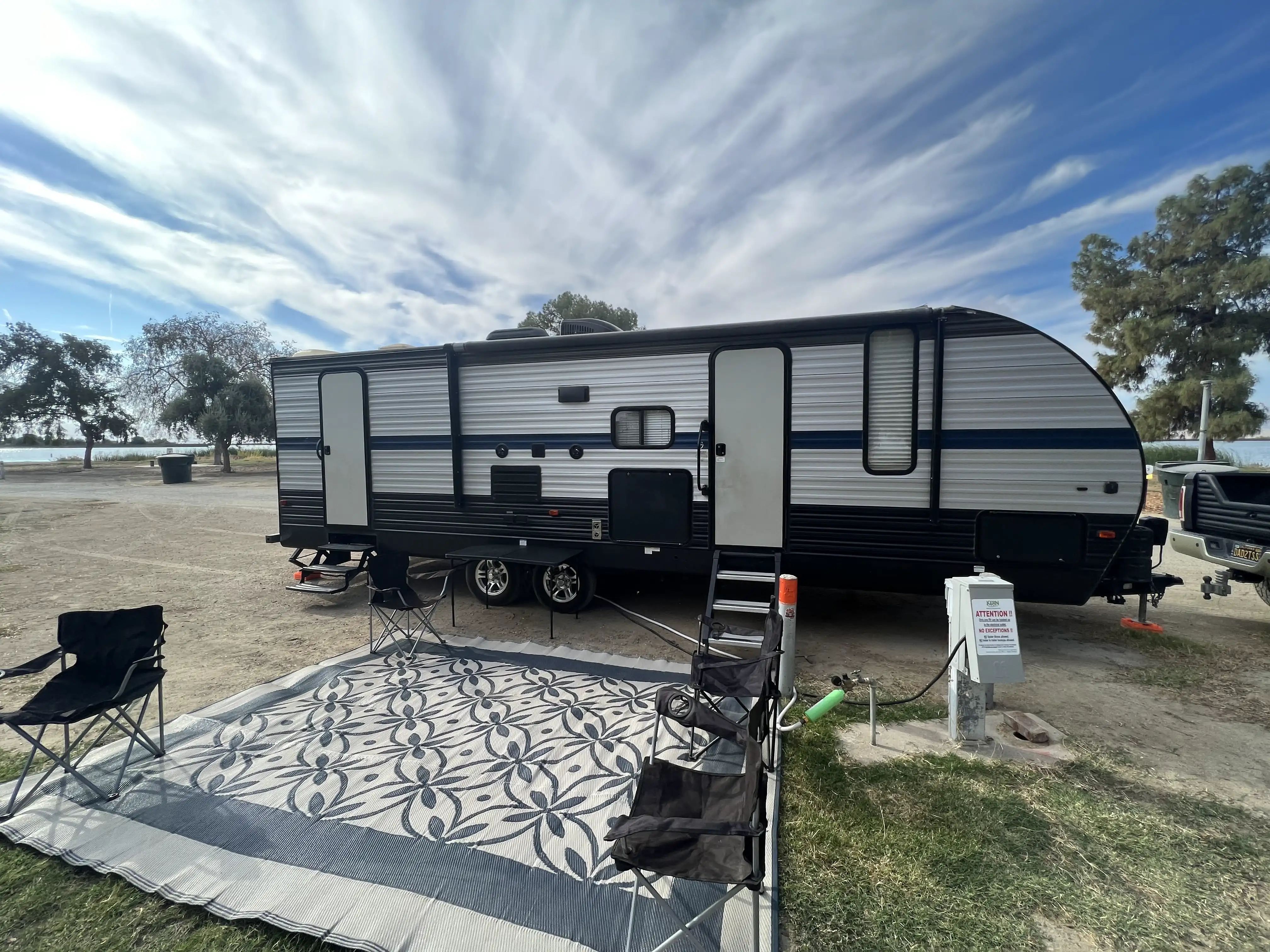 The Cherokee is perfect for making lifelong family memories! It has plenty of room to sleep 8-10 people. The master room has a queen size bed with a comfortable mattress topper. There are two large bunk beds with curtains for privacy. The booth dinette & couch both turn into a bed as well. The kitchen has a farmhouse style sink that has a top cover for additional counter space to utilize and a large pantry to store all of your food. This trailer also has a nice outdoor kitchen to make the time you spend outside of the trailer easier.