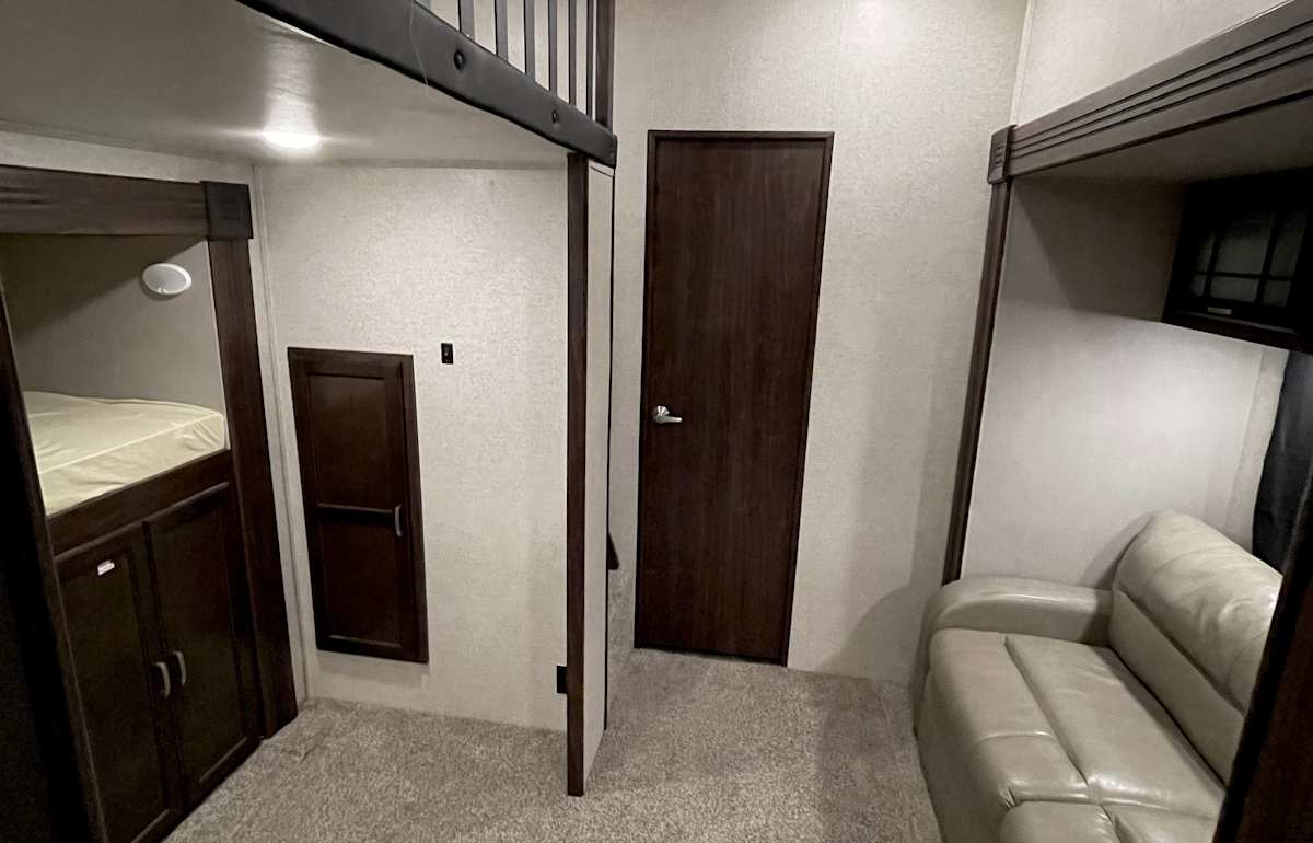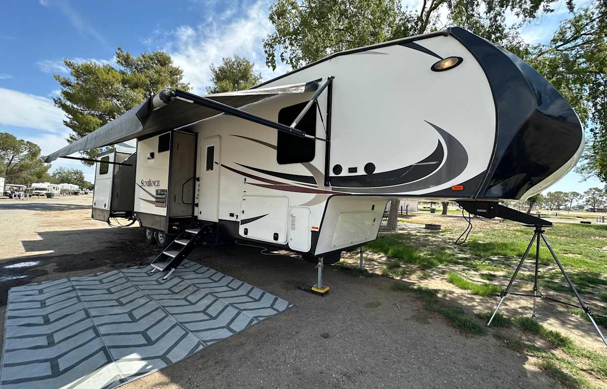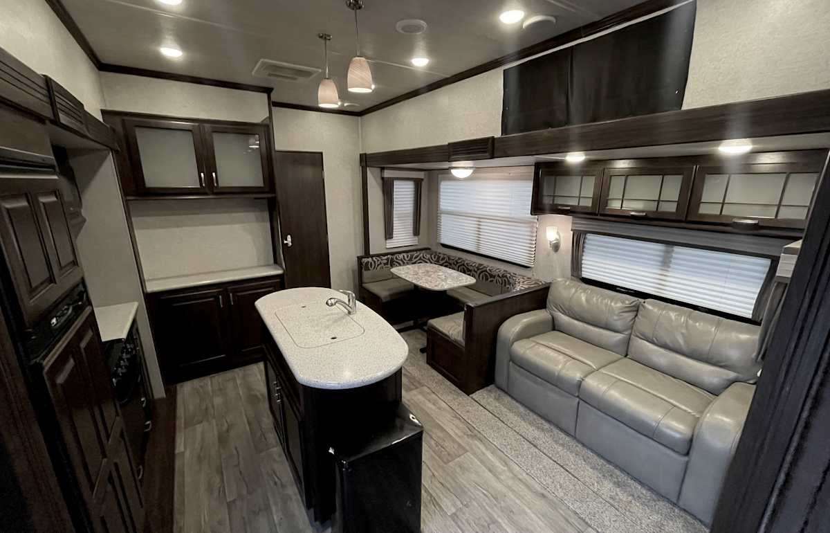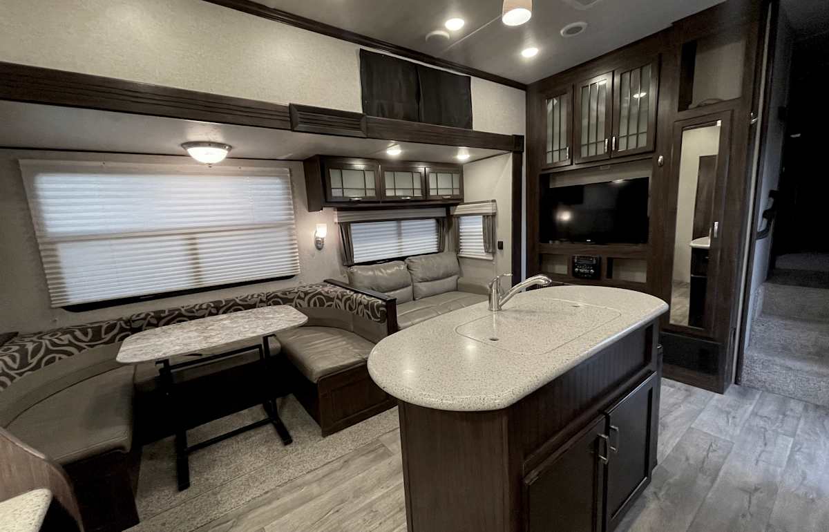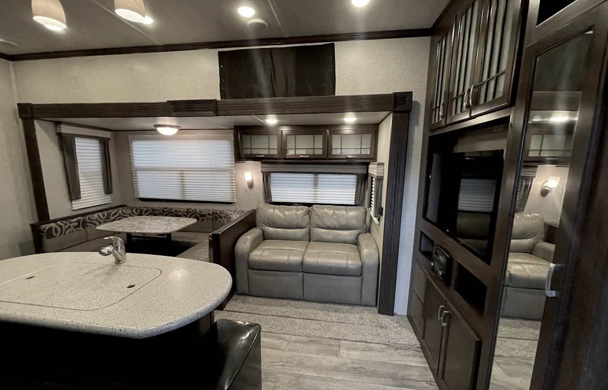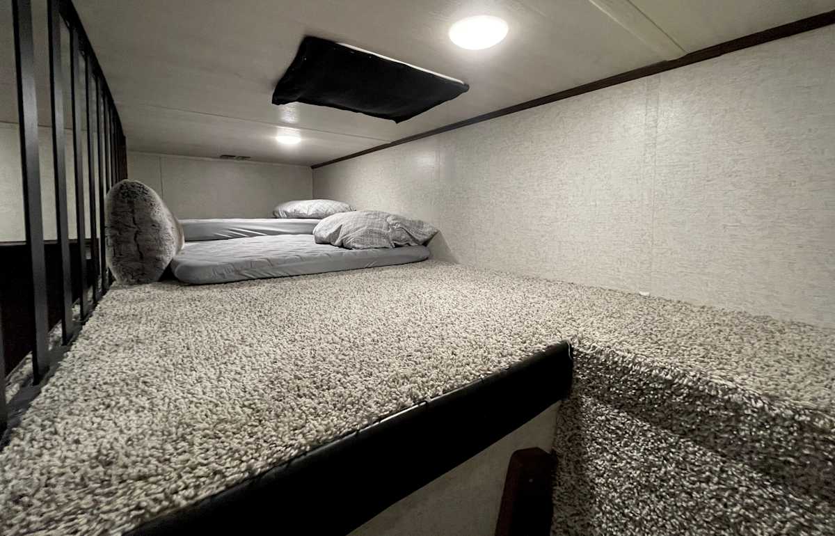This massive 5th wheel is perfect for making lifelong memories with a large group! It has plenty of room to sleep 10 people. With a spacious master room & bunk room as well as 2 full bathrooms, this rig really has it all! The master room has a queen size bed with a comfortable mattress topper. There is a large bunk room with a loft, pull out couch, and a twin bed. There is also a full bathroom that is connected to the bunk room. The living area has a booth dinette & couch that both turn into a bed. The kitchen has an island, lots of counter space & plenty of cabinet space. There is an outside kitchen that includes a sink, mini fridge, cabinets for extra storage and a pull out counter top that you can utilize for cooking.