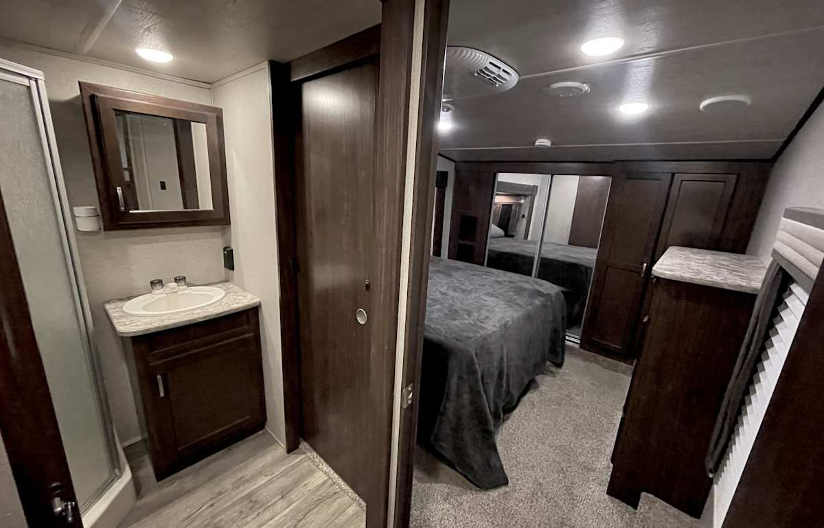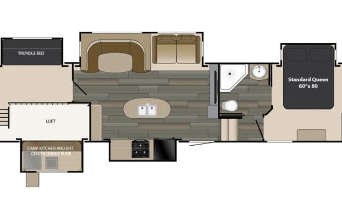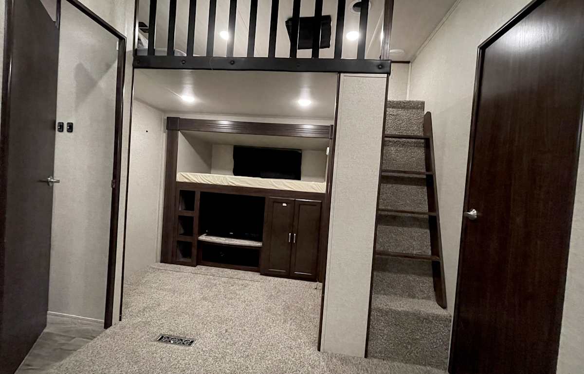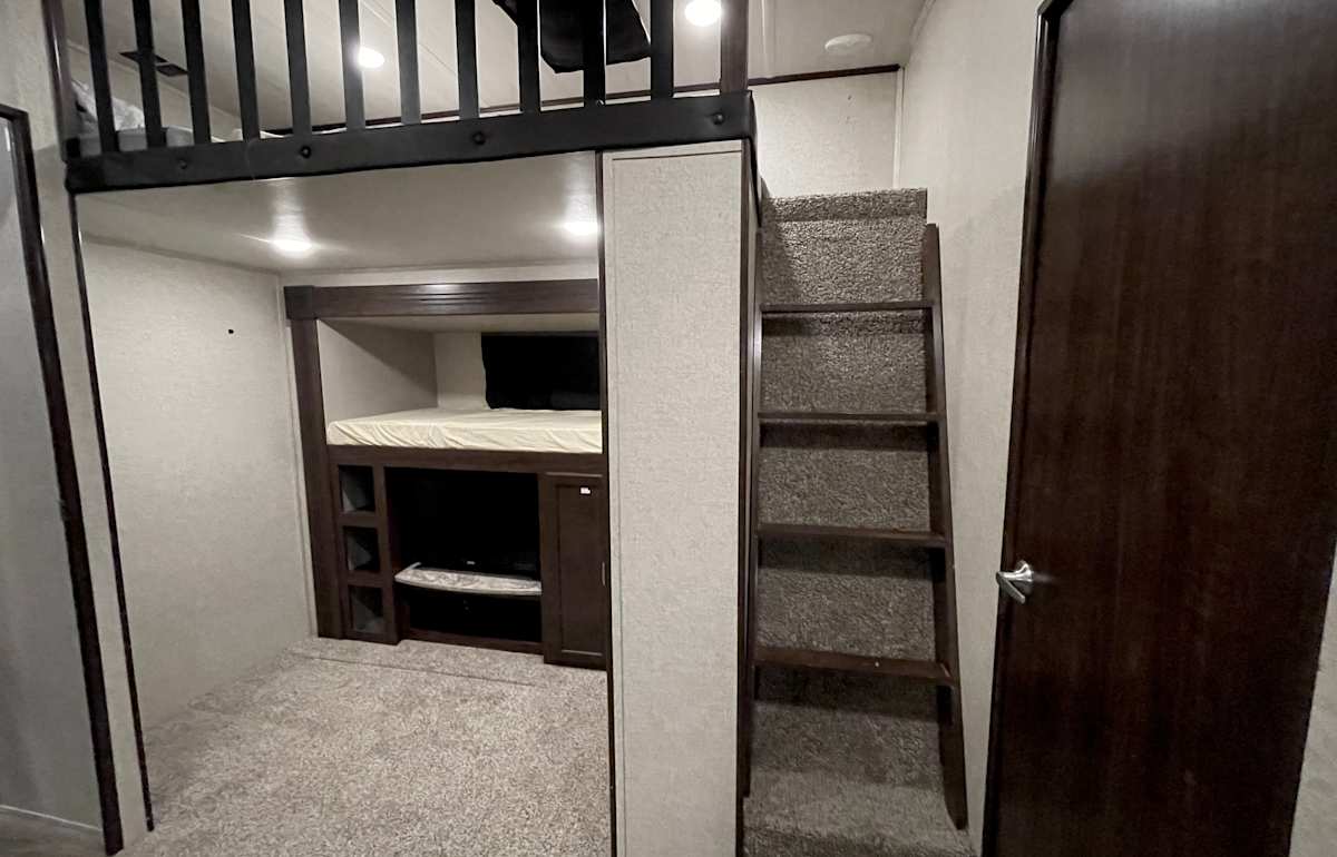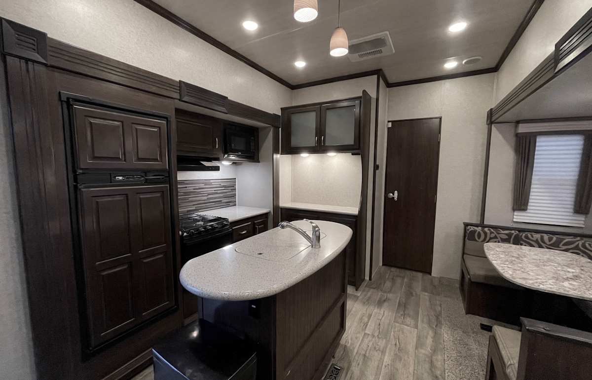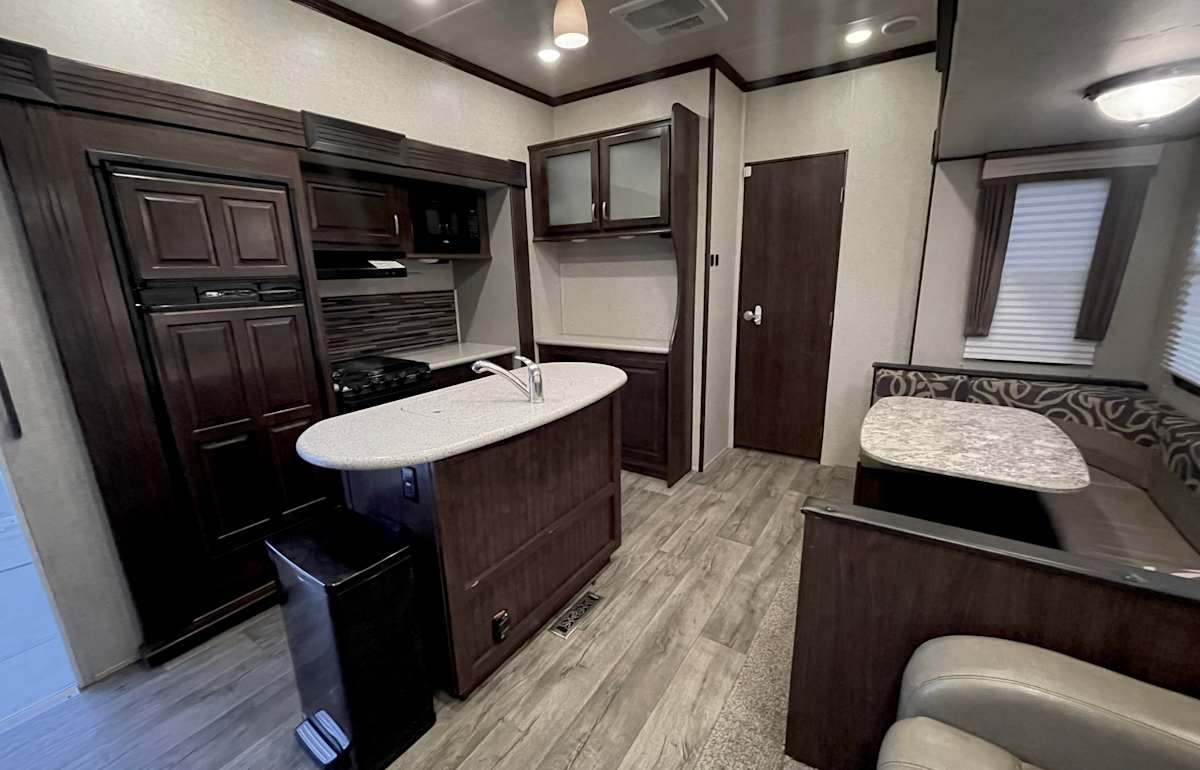This massive 5th wheel is perfect for making lifelong memories with a large group! It has plenty of room to sleep 10 people. With a spacious master room & bunk room as well as 2 full bathrooms, this rig really has it all! The master room has a queen size bed with a comfortable mattress topper. There is a large bunk room with a loft, pull out couch, and a twin bed. There is also a full bathroom that is connected to the bunk room. The living area has a booth dinette & couch that both turn into a bed. The kitchen has an island, lots of counter space & plenty of cabinet space. There is an outside kitchen that includes a sink, mini fridge, cabinets for extra storage and a pull out counter top that you can utilize for cooking.