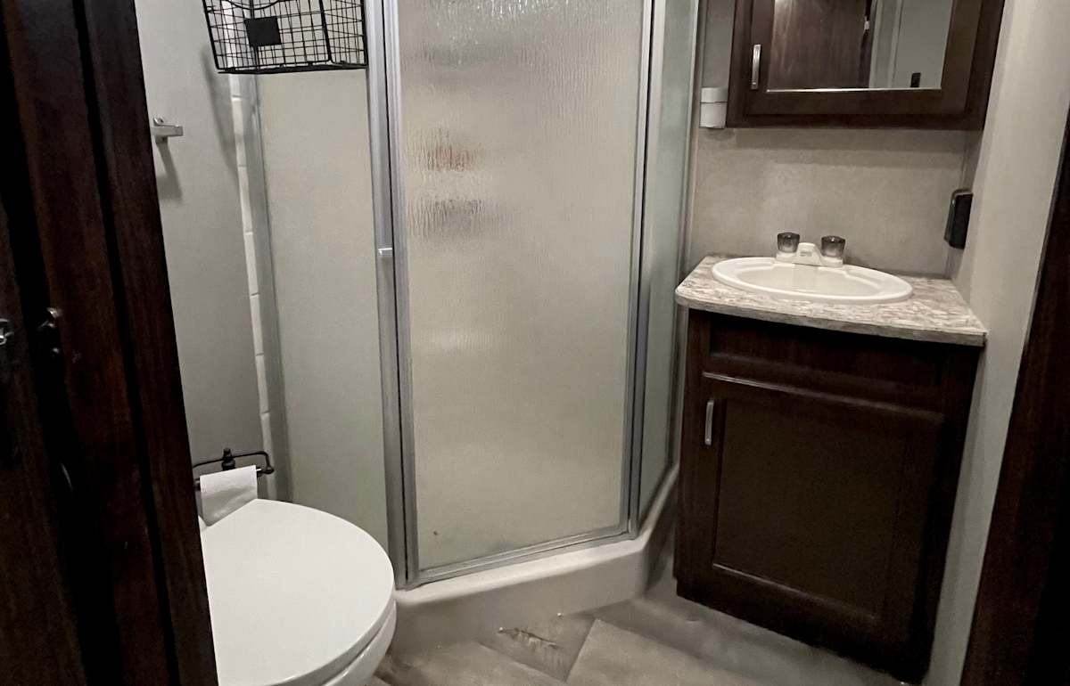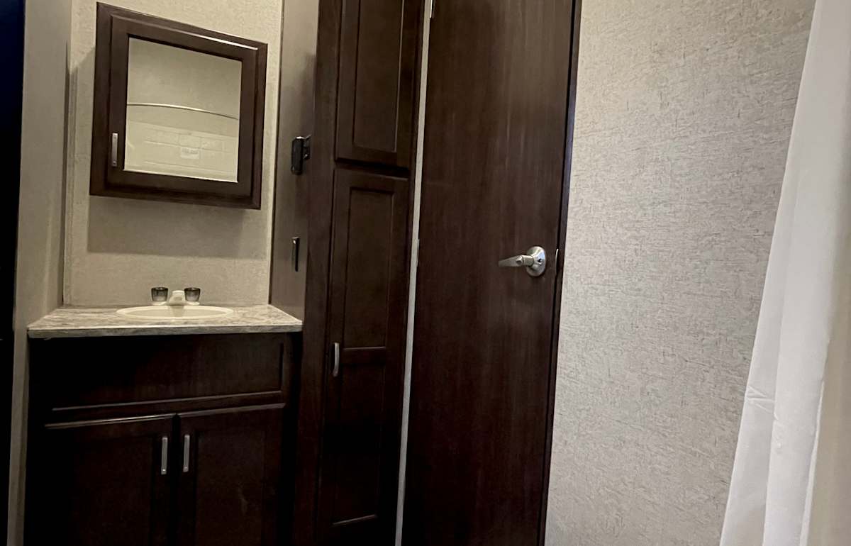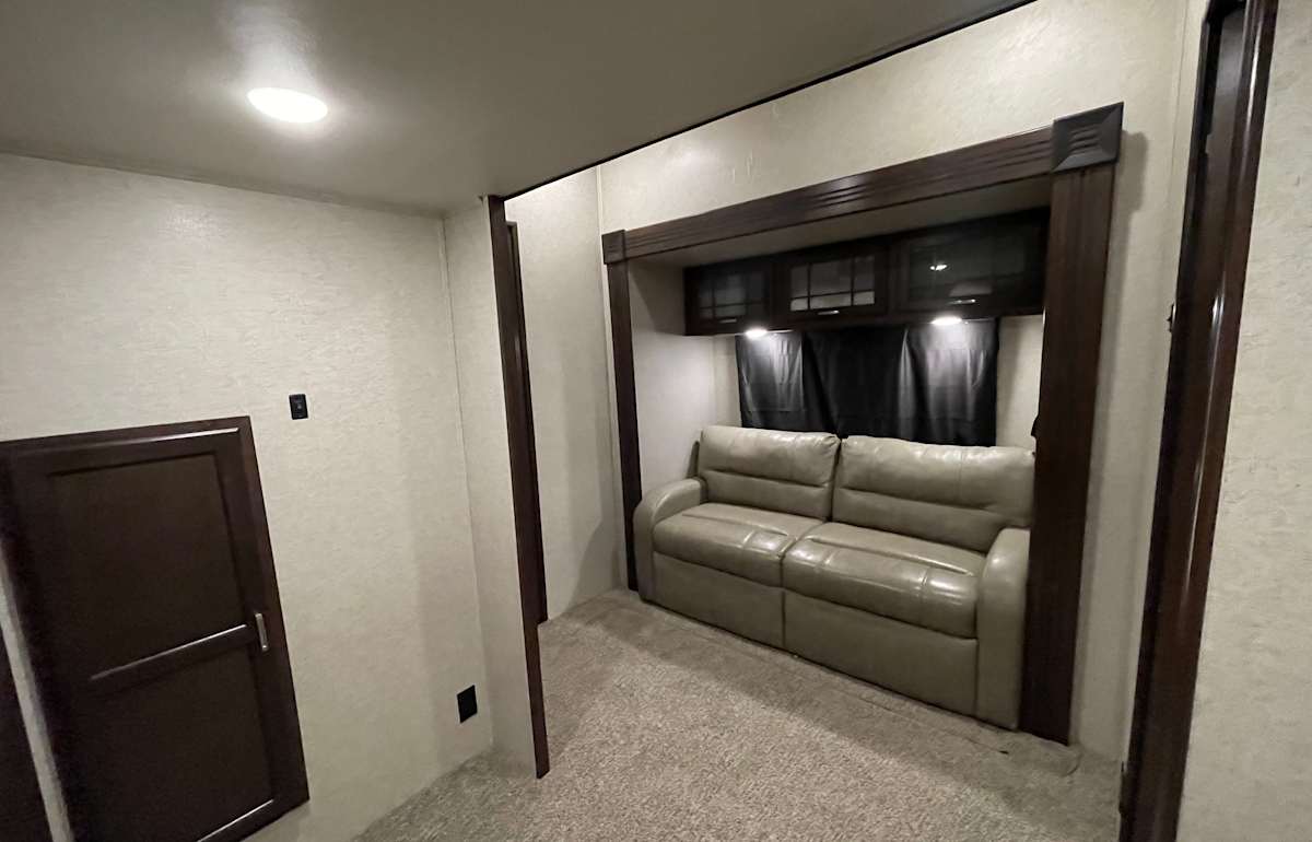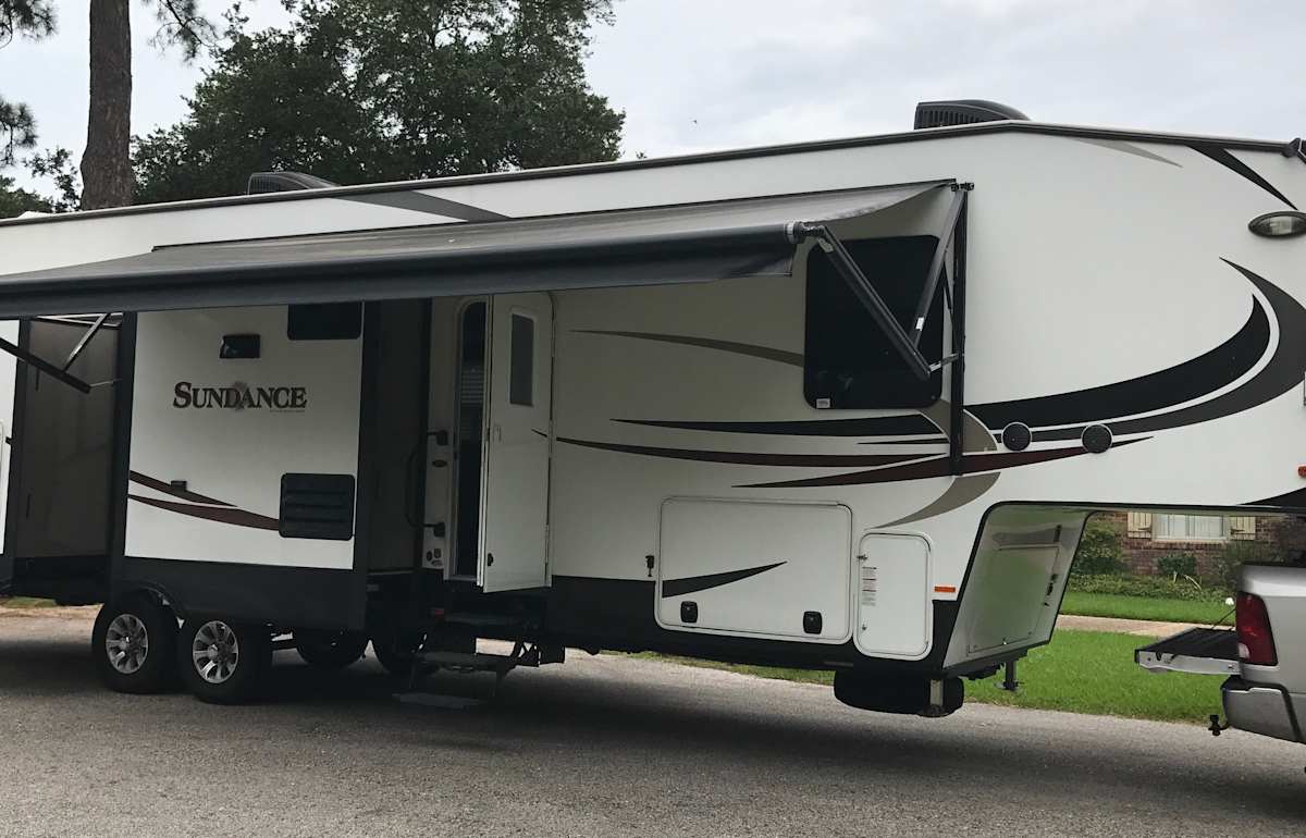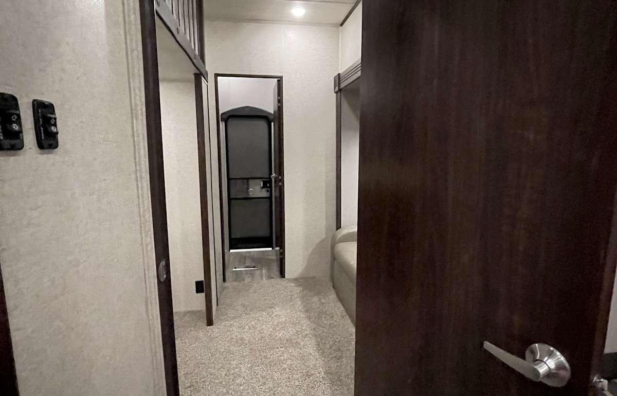 This massive 5th wheel is perfect for making lifelong memories with a large group! It has plenty of room to sleep 10 people. With a spacious master room & bunk room as well as 2 full bathrooms, this rig really has it all! The master room has a queen size bed with a comfortable mattress topper. There is a large bunk room with a loft, pull out couch, and a twin bed. There is also a full bathroom that is connected to the bunk room. The living area has a booth dinette & couch that both turn into a bed. The kitchen has an island, lots of counter space & plenty of cabinet space. There is an outside kitchen that includes a sink, mini fridge, cabinets for extra storage and a pull out counter top that you can utilize for cooking.