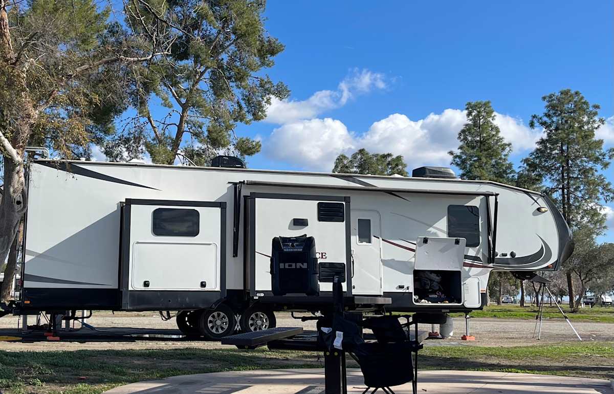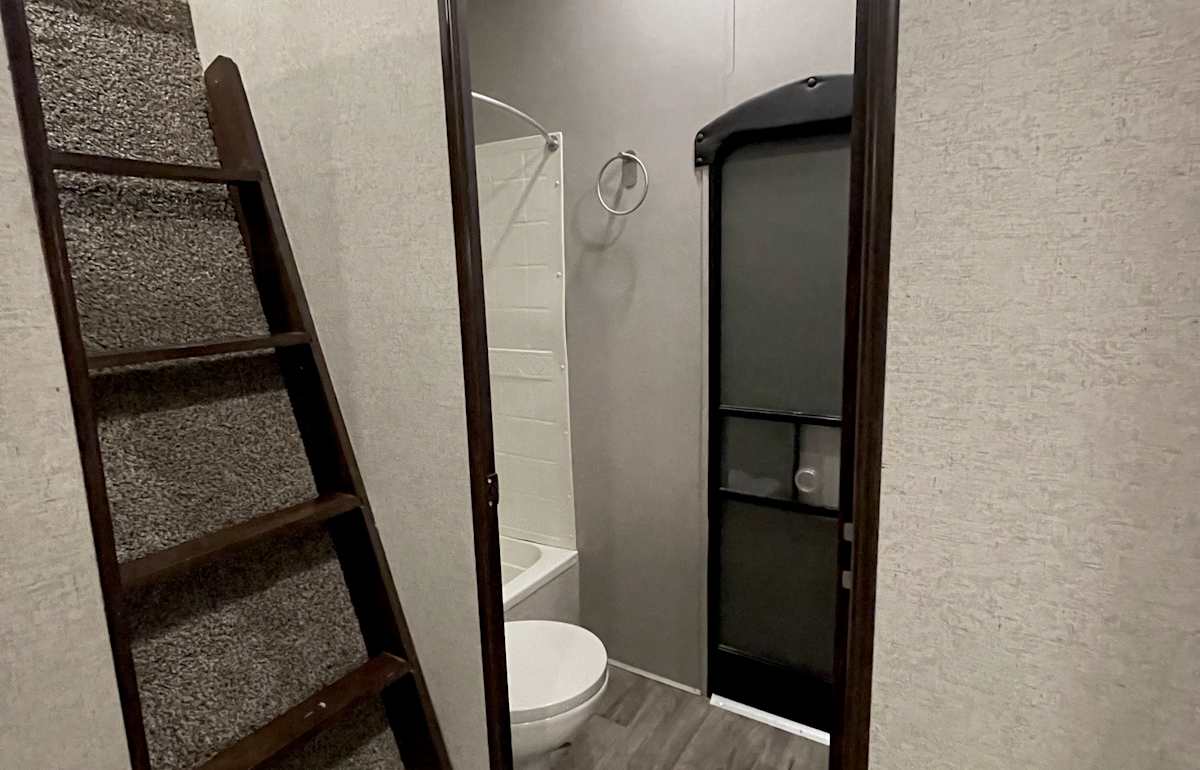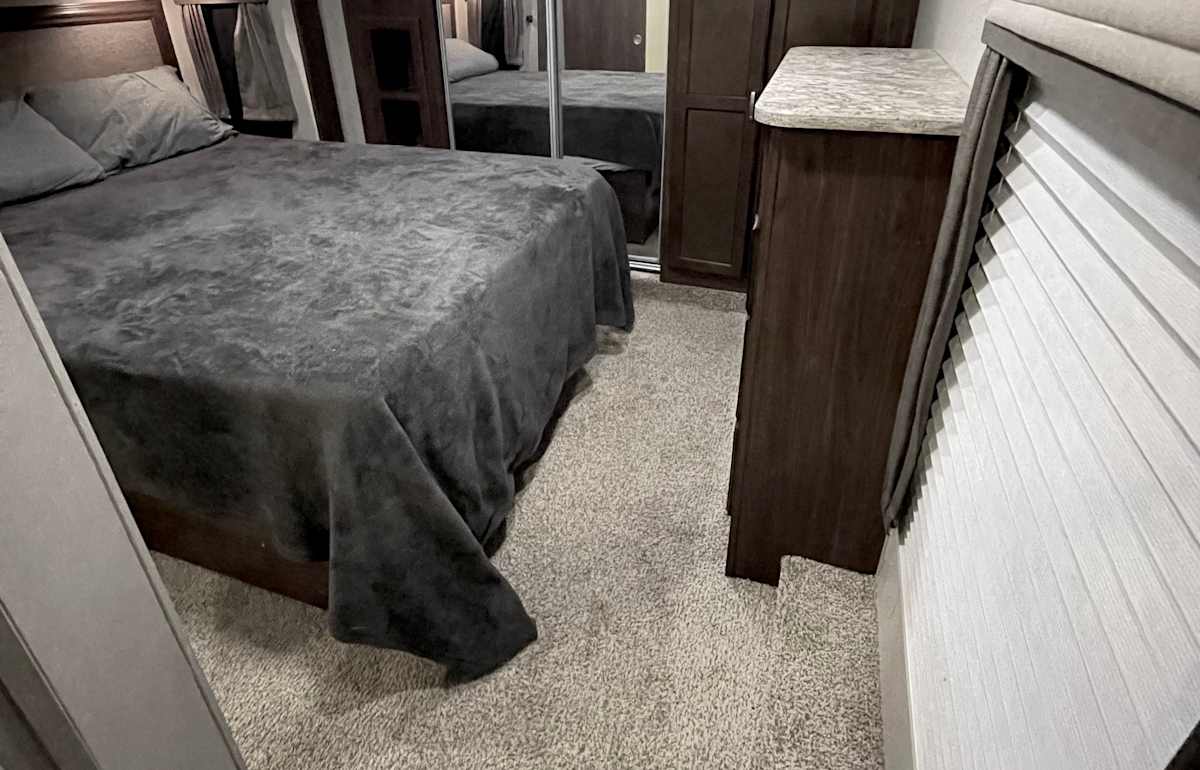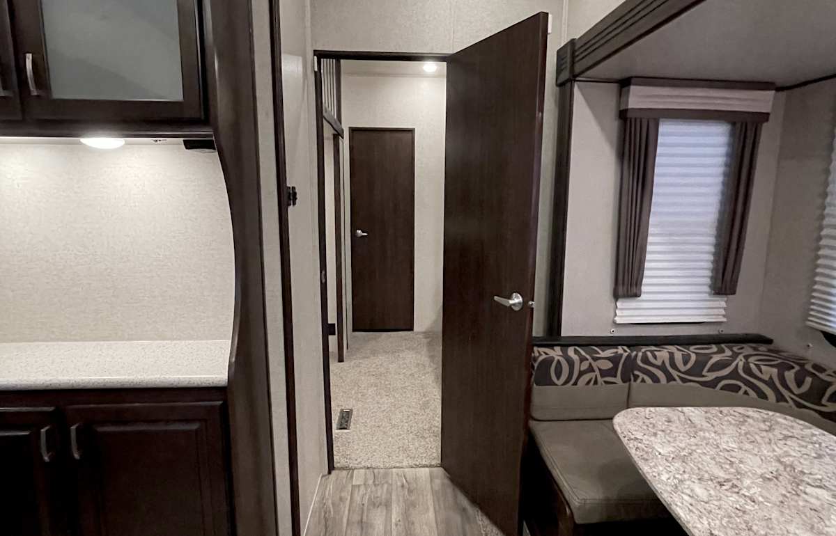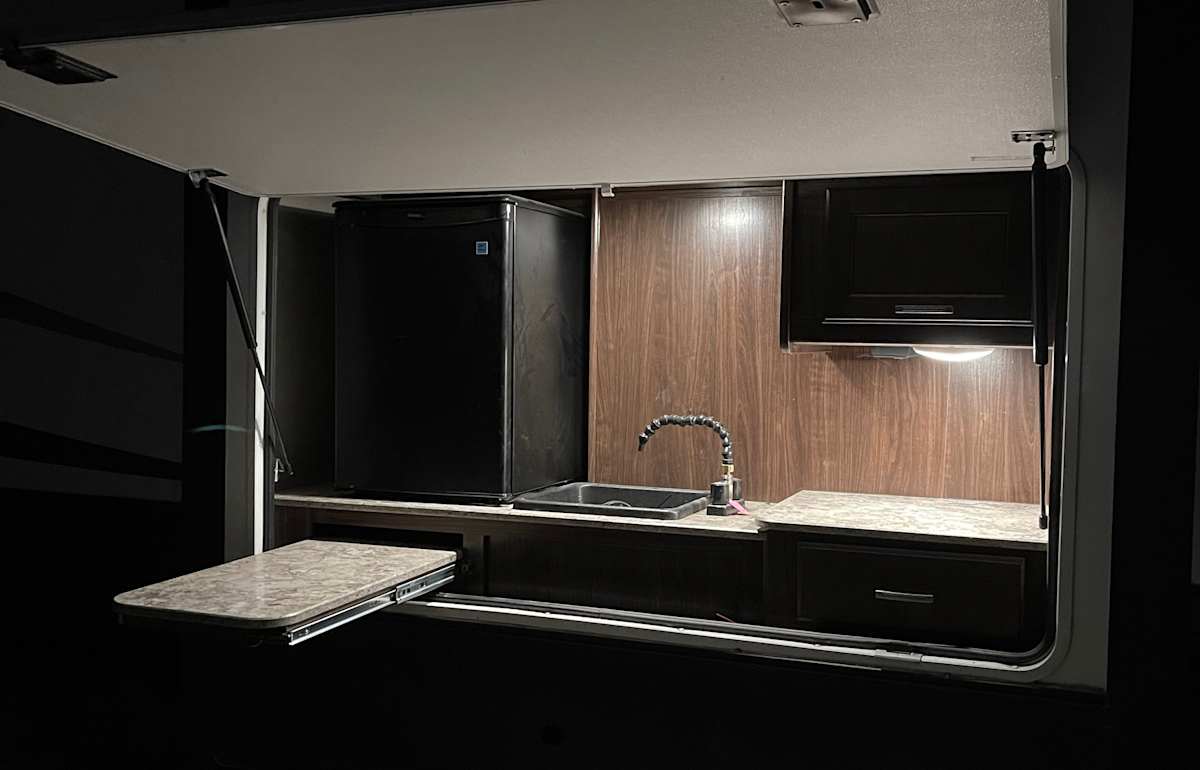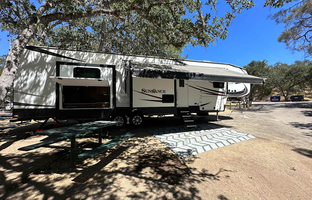 This massive 5th wheel is perfect for making lifelong memories with a large group! It has plenty of room to sleep 10 people. With a spacious master room & bunk room as well as 2 full bathrooms, this rig really has it all! The master room has a queen size bed with a comfortable mattress topper. There is a large bunk room with a loft, pull out couch, and a twin bed. There is also a full bathroom that is connected to the bunk room. The living area has a booth dinette & couch that both turn into a bed. The kitchen has an island, lots of counter space & plenty of cabinet space. There is an outside kitchen that includes a sink, mini fridge, cabinets for extra storage and a pull out counter top that you can utilize for cooking.