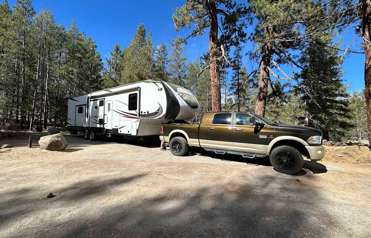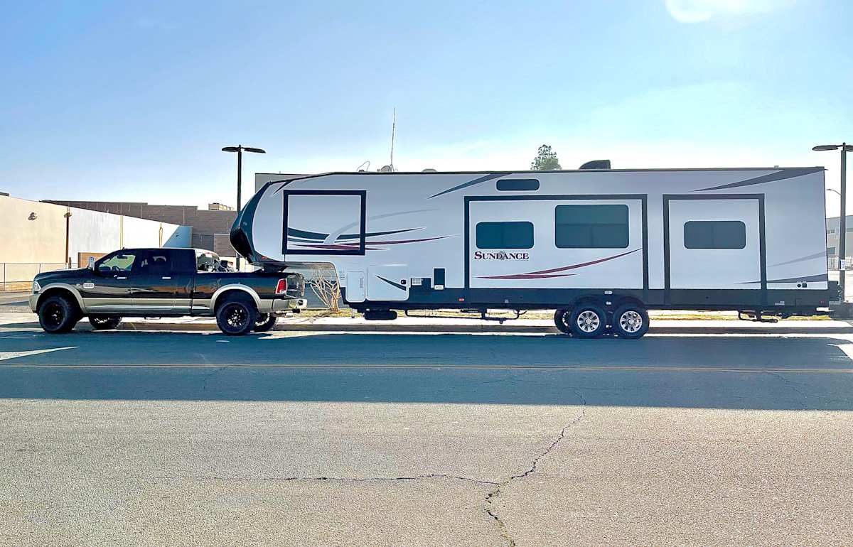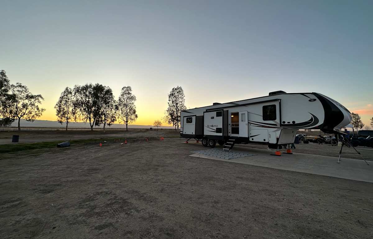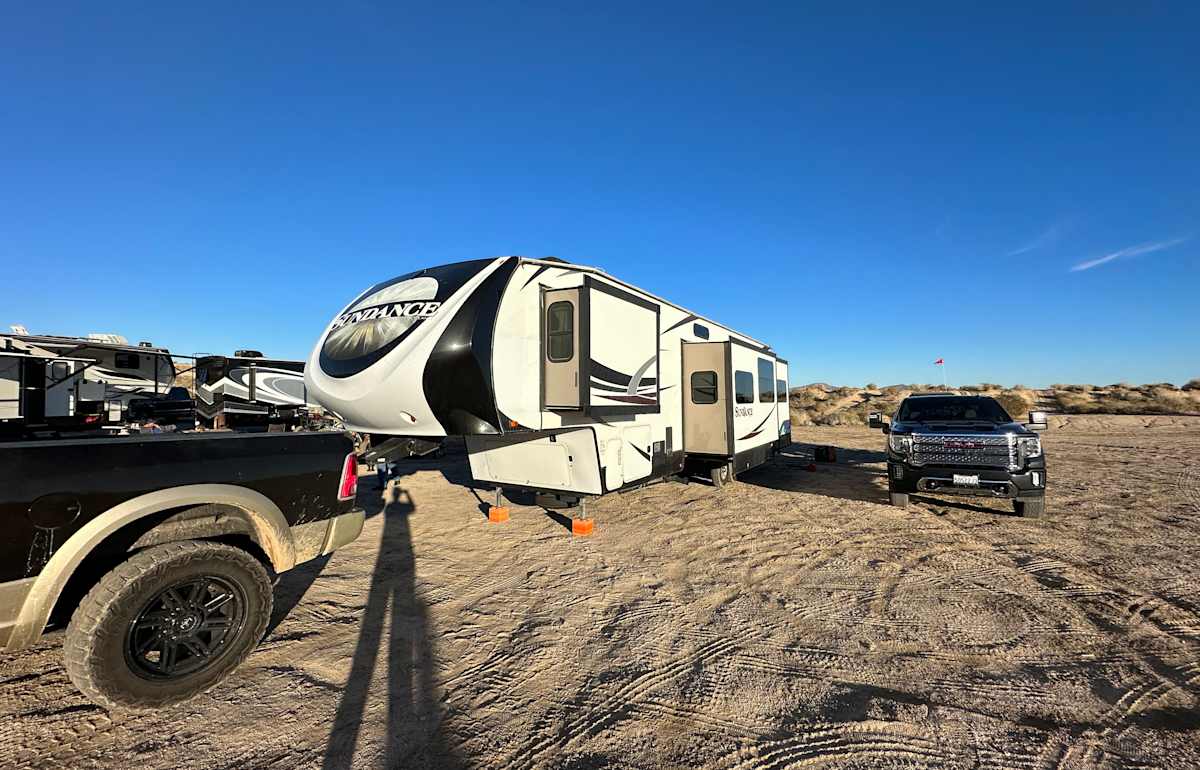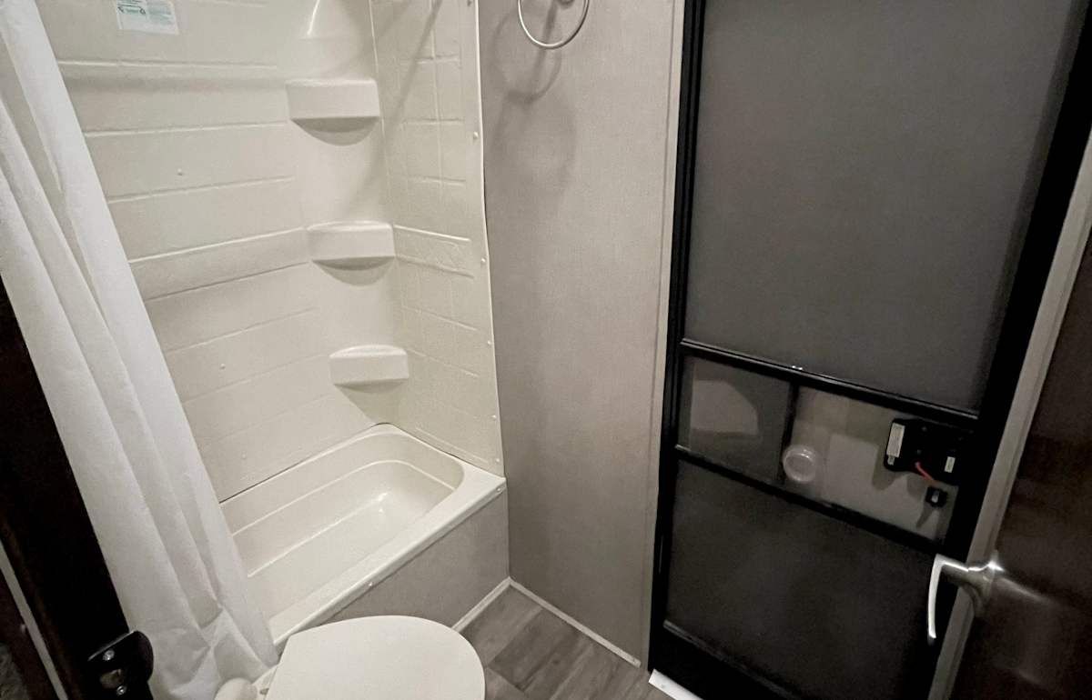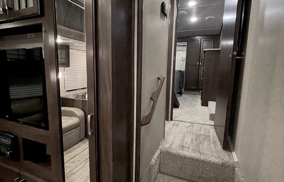 This massive 5th wheel is perfect for making lifelong memories with a large group! It has plenty of room to sleep 10 people. With a spacious master room & bunk room as well as 2 full bathrooms, this rig really has it all! The master room has a queen size bed with a comfortable mattress topper. There is a large bunk room with a loft, pull out couch, and a twin bed. There is also a full bathroom that is connected to the bunk room. The living area has a booth dinette & couch that both turn into a bed. The kitchen has an island, lots of counter space & plenty of cabinet space. There is an outside kitchen that includes a sink, mini fridge, cabinets for extra storage and a pull out counter top that you can utilize for cooking.
