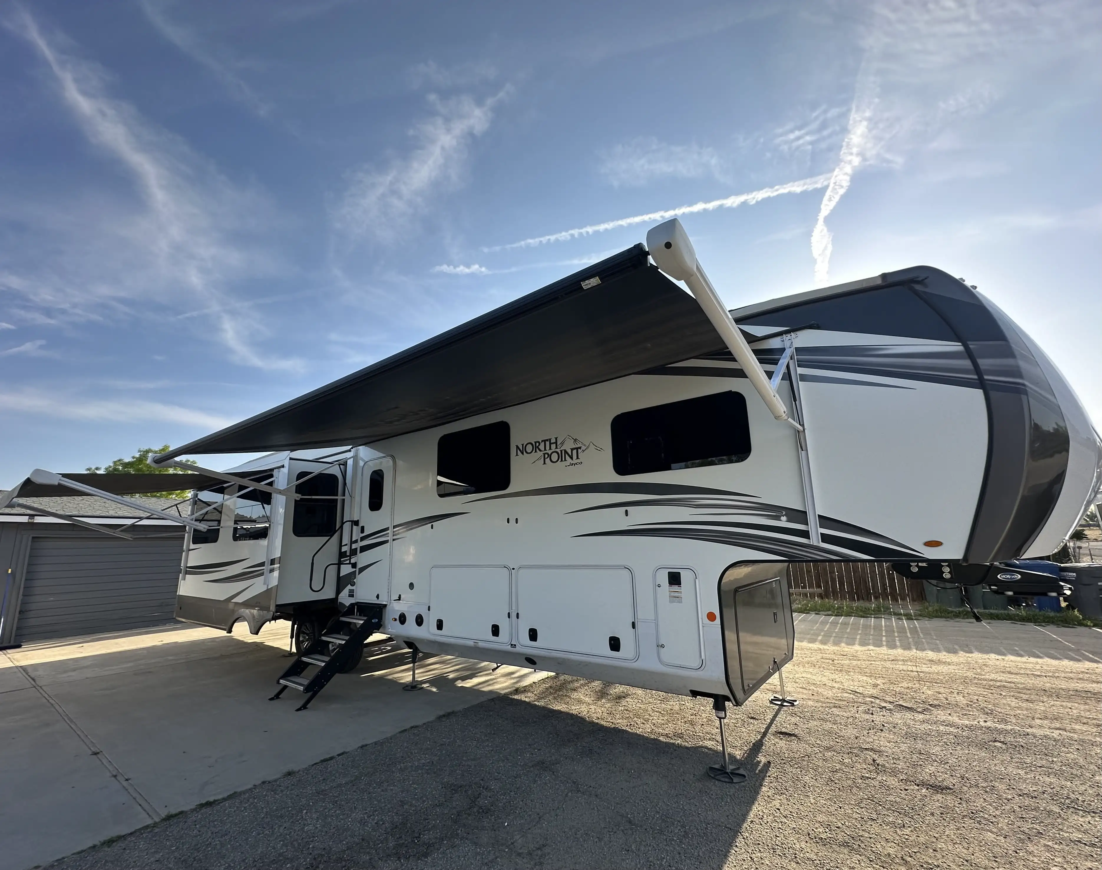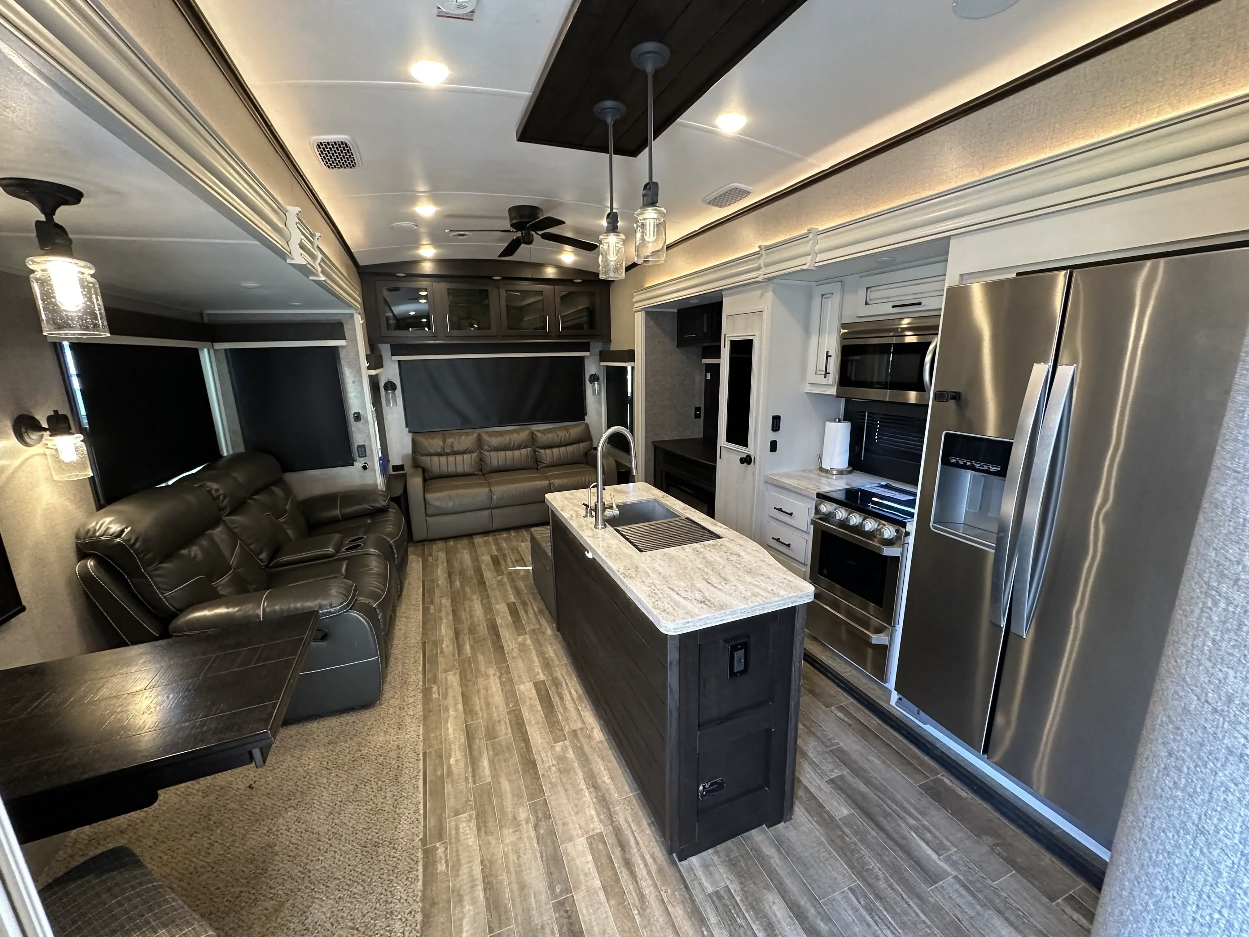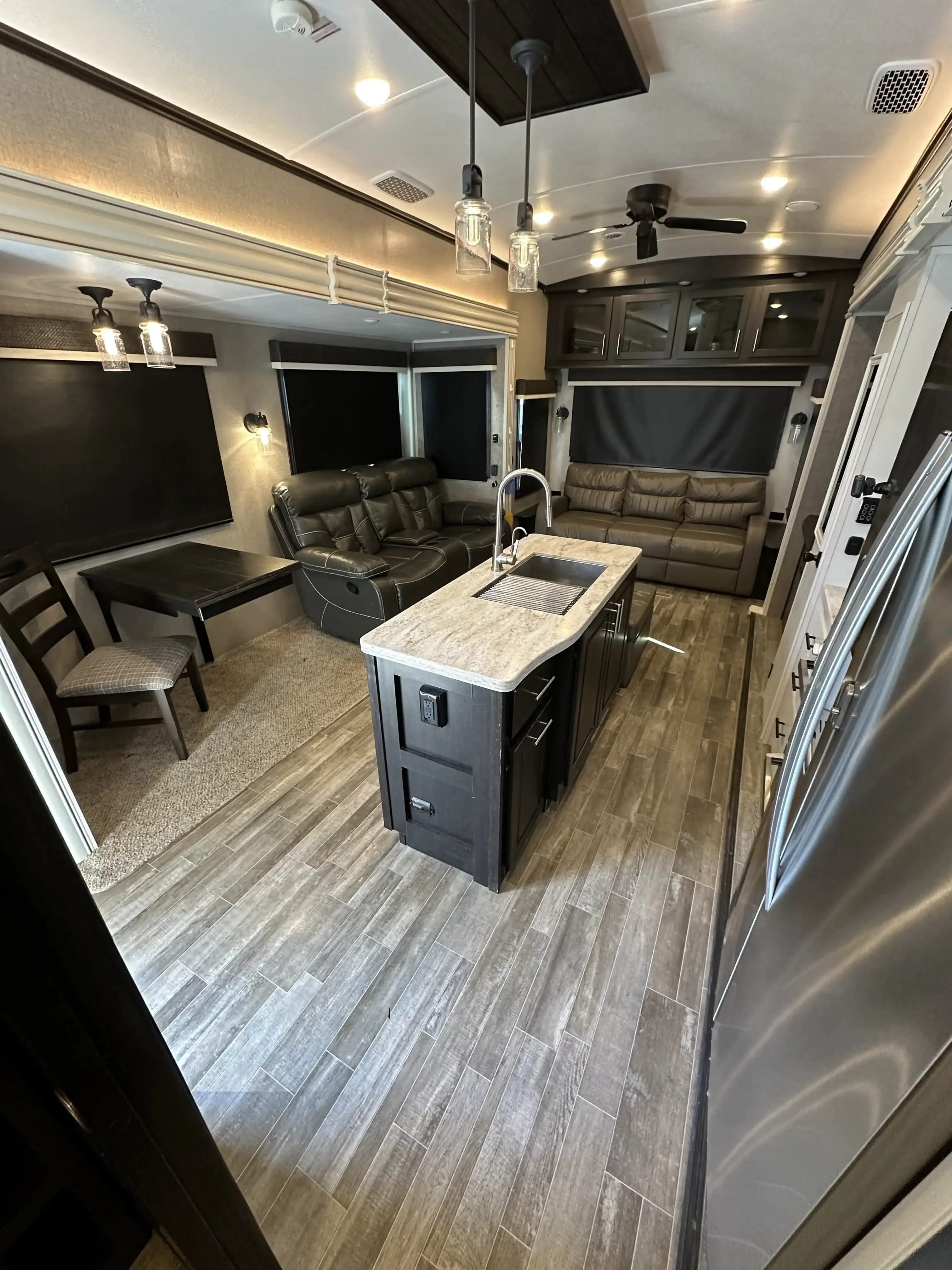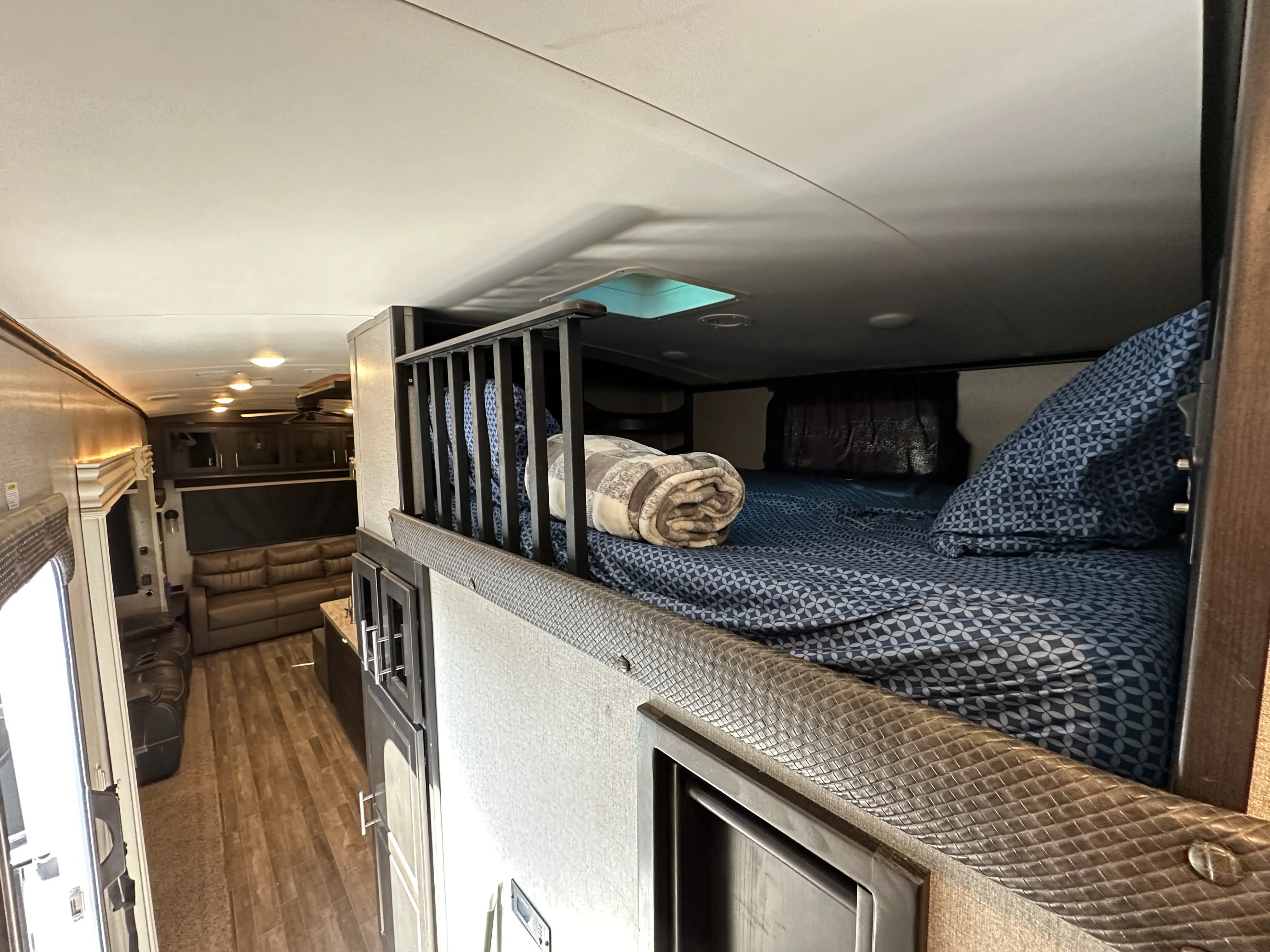 This massive 5th wheel is perfect for making lifelong memories with a large group! It has plenty of room to sleep 8+ people. With a spacious master room & bunk room. This rig really has it all! The master room has a King size bed with a mattress that was recently upgraded. There is a separate bunk room with a small pull down bed and a full size pull out couch bed. The loft has two twin beds. The living area has a dining room table with chairs, two comfortable reclining chairs & couch that pulls out into a queen size bed. The kitchen has an island, lots of counter space & plenty of cabinet/pantry space. We have installed a large smart TV that sits on top of an electric fireplace. There is an outside kitchen that includes a sink, mini fridge, cabinets for extra storage and a pull out counter top.