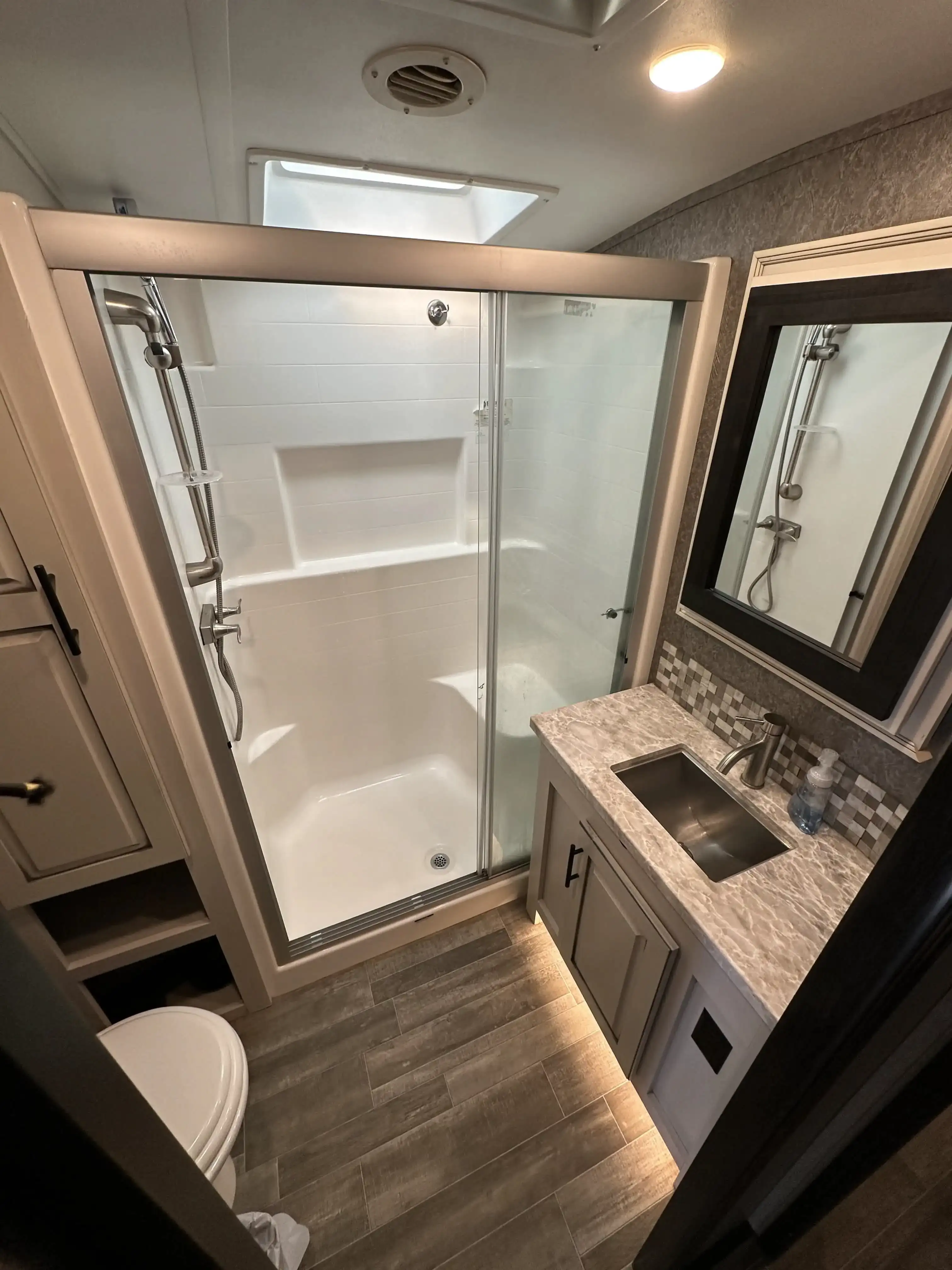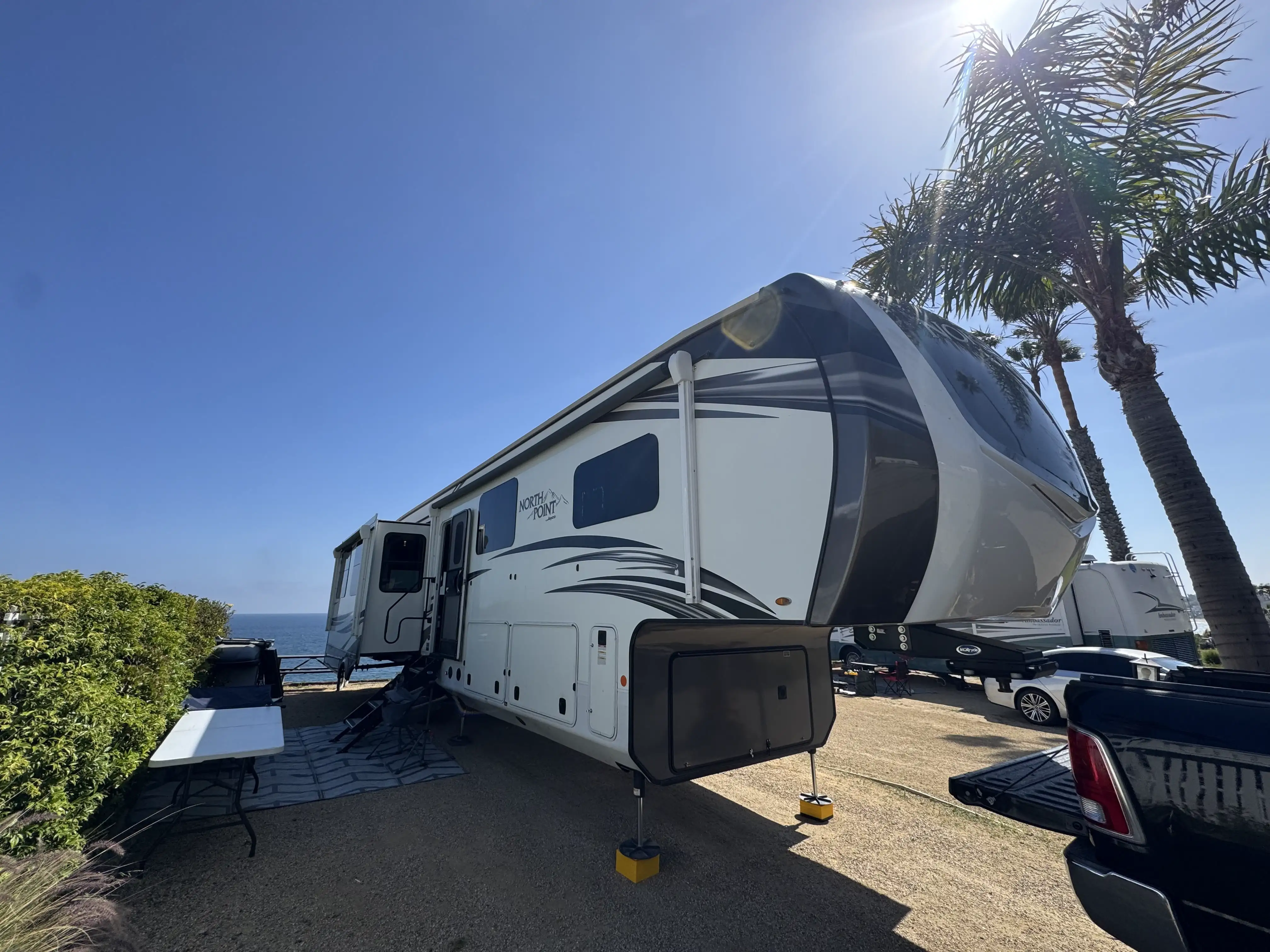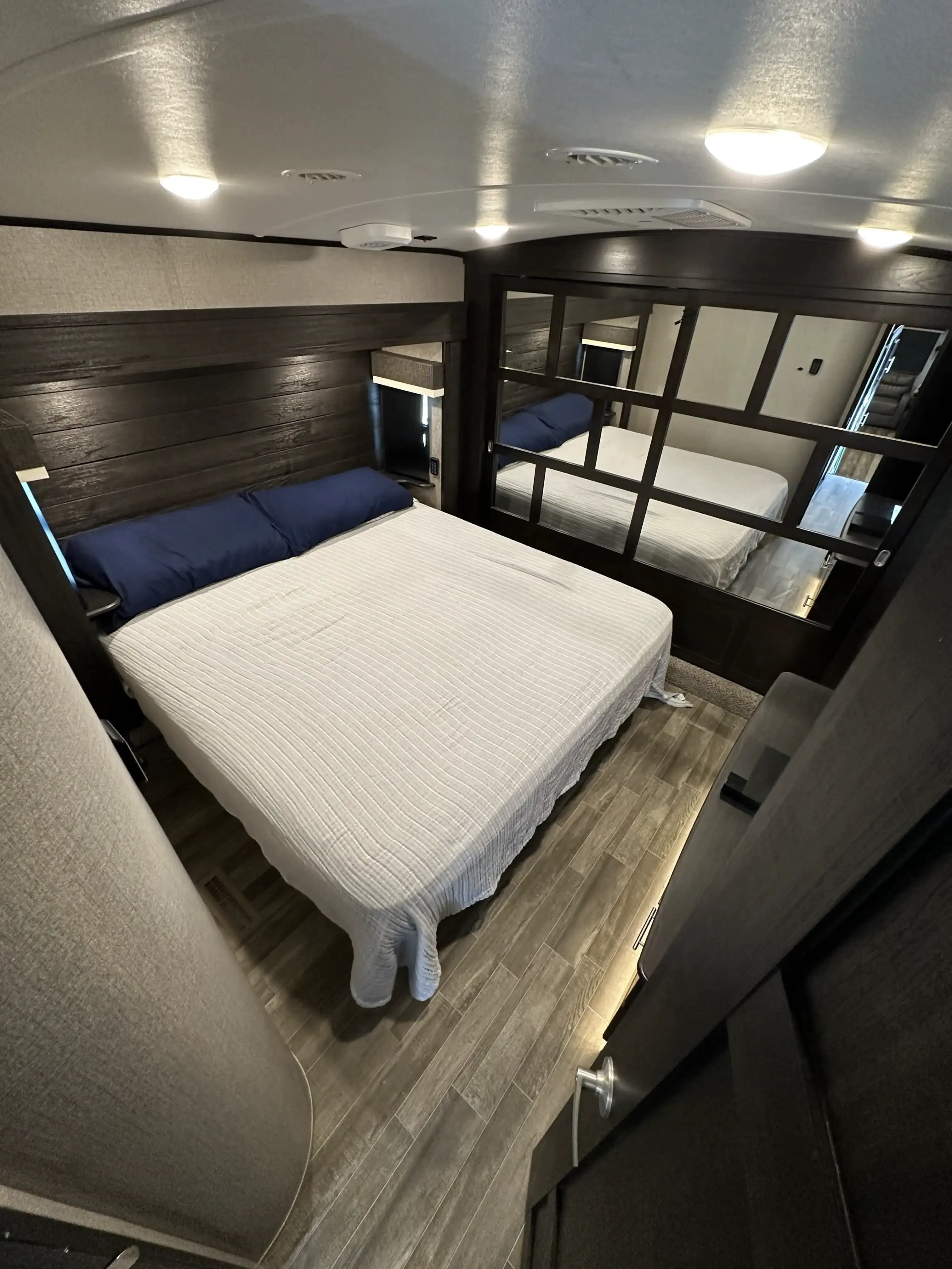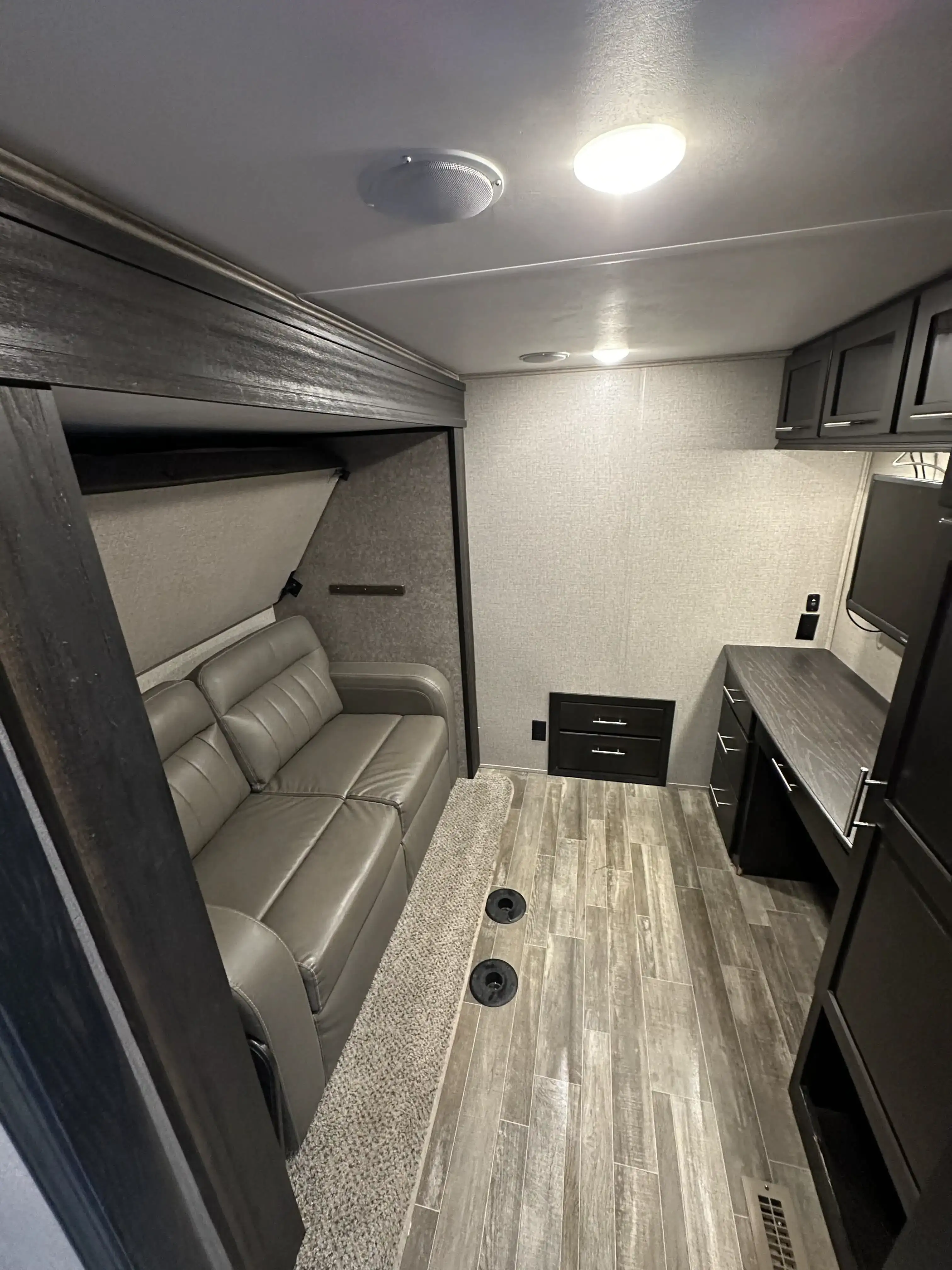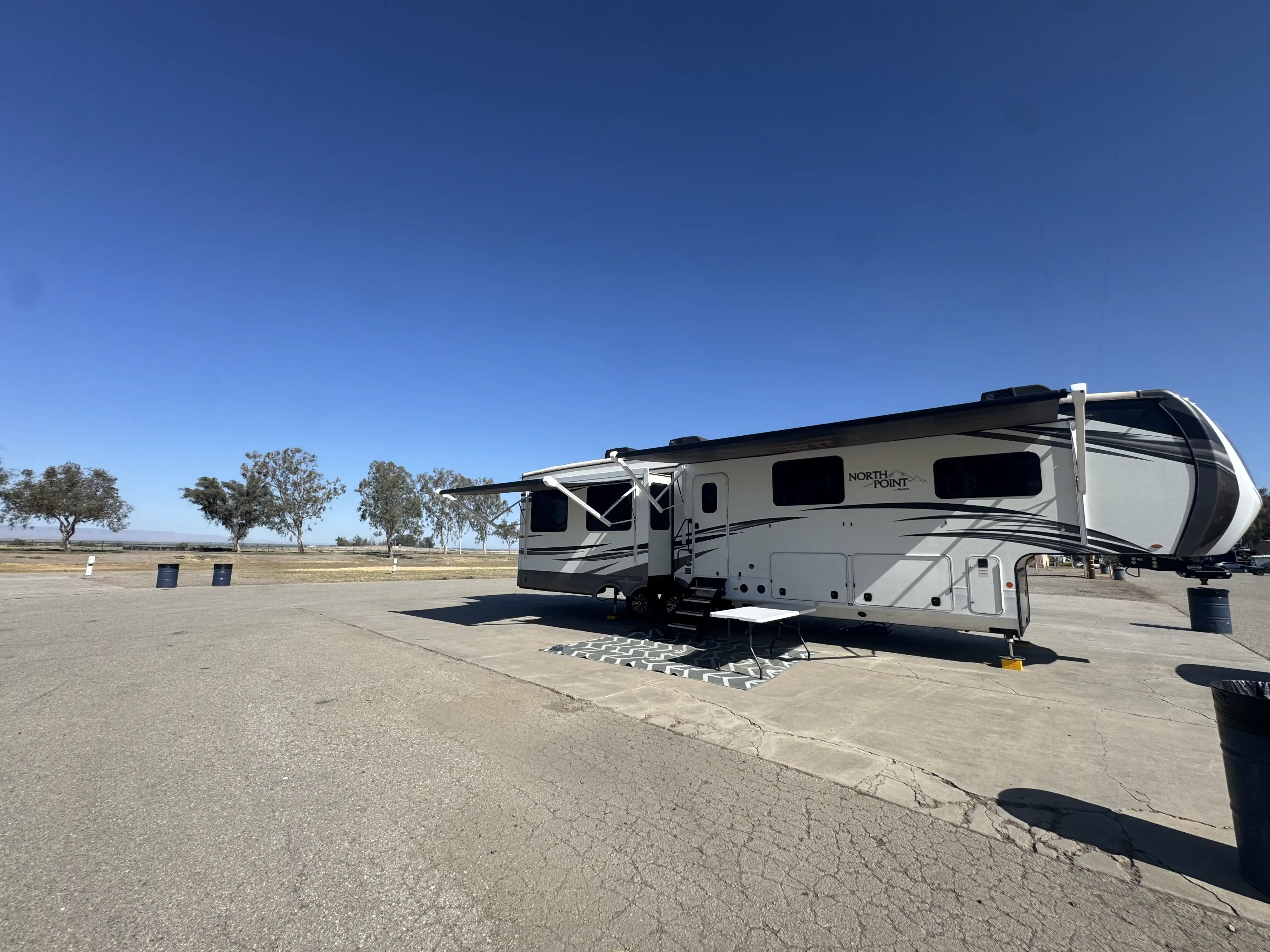 This massive 5th wheel is perfect for making lifelong memories with a large group! It has plenty of room to sleep 8+ people. With a spacious master room & bunk room. This rig really has it all! The master room has a King size bed with a mattress that was recently upgraded. There is a separate bunk room with a small pull down bed and a full size pull out couch bed. The loft has two twin beds. The living area has a dining room table with chairs, two comfortable reclining chairs & couch that pulls out into a queen size bed. The kitchen has an island, lots of counter space & plenty of cabinet/pantry space. We have installed a large smart TV that sits on top of an electric fireplace. There is an outside kitchen that includes a sink, mini fridge, cabinets for extra storage and a pull out counter top.