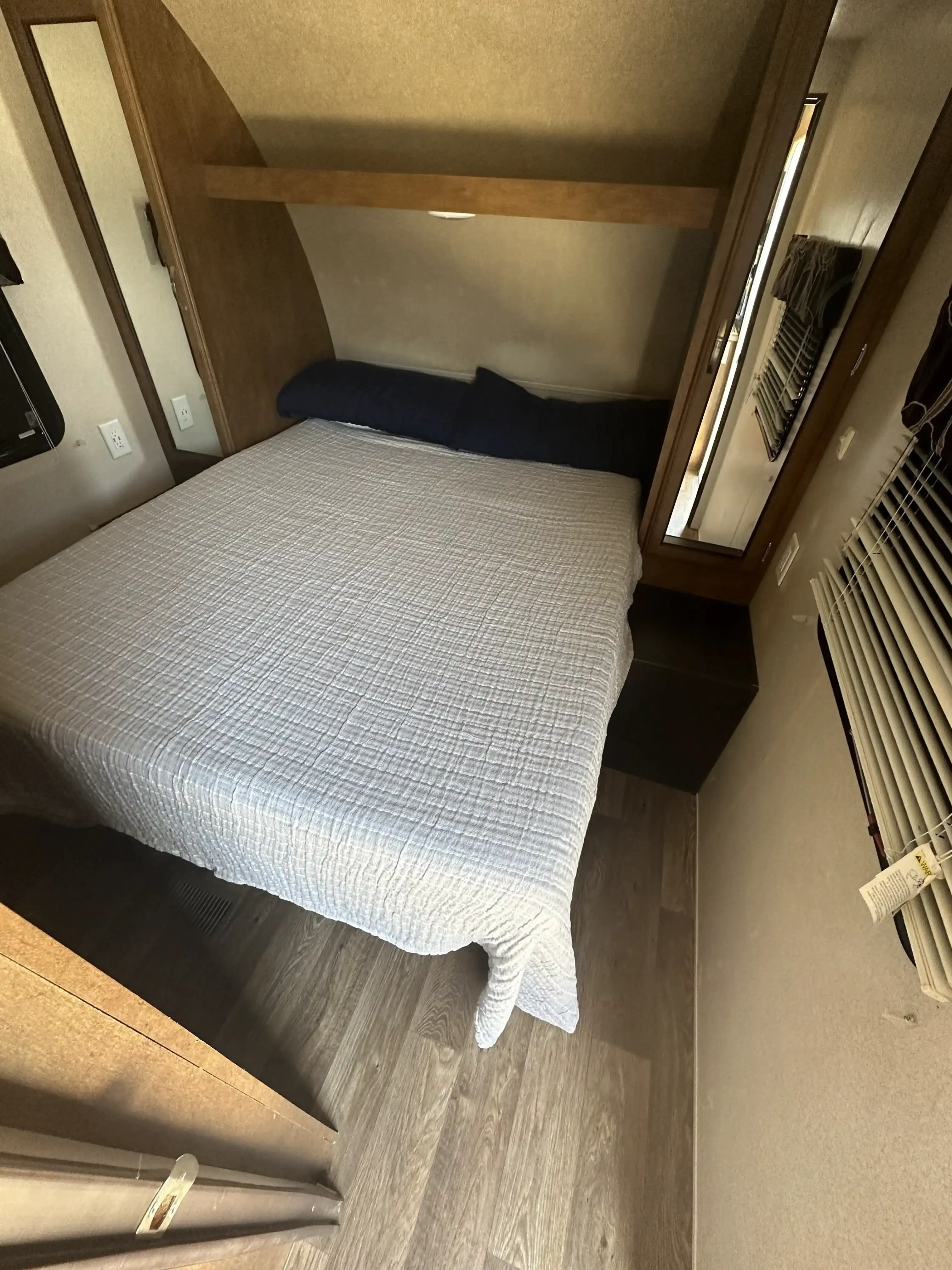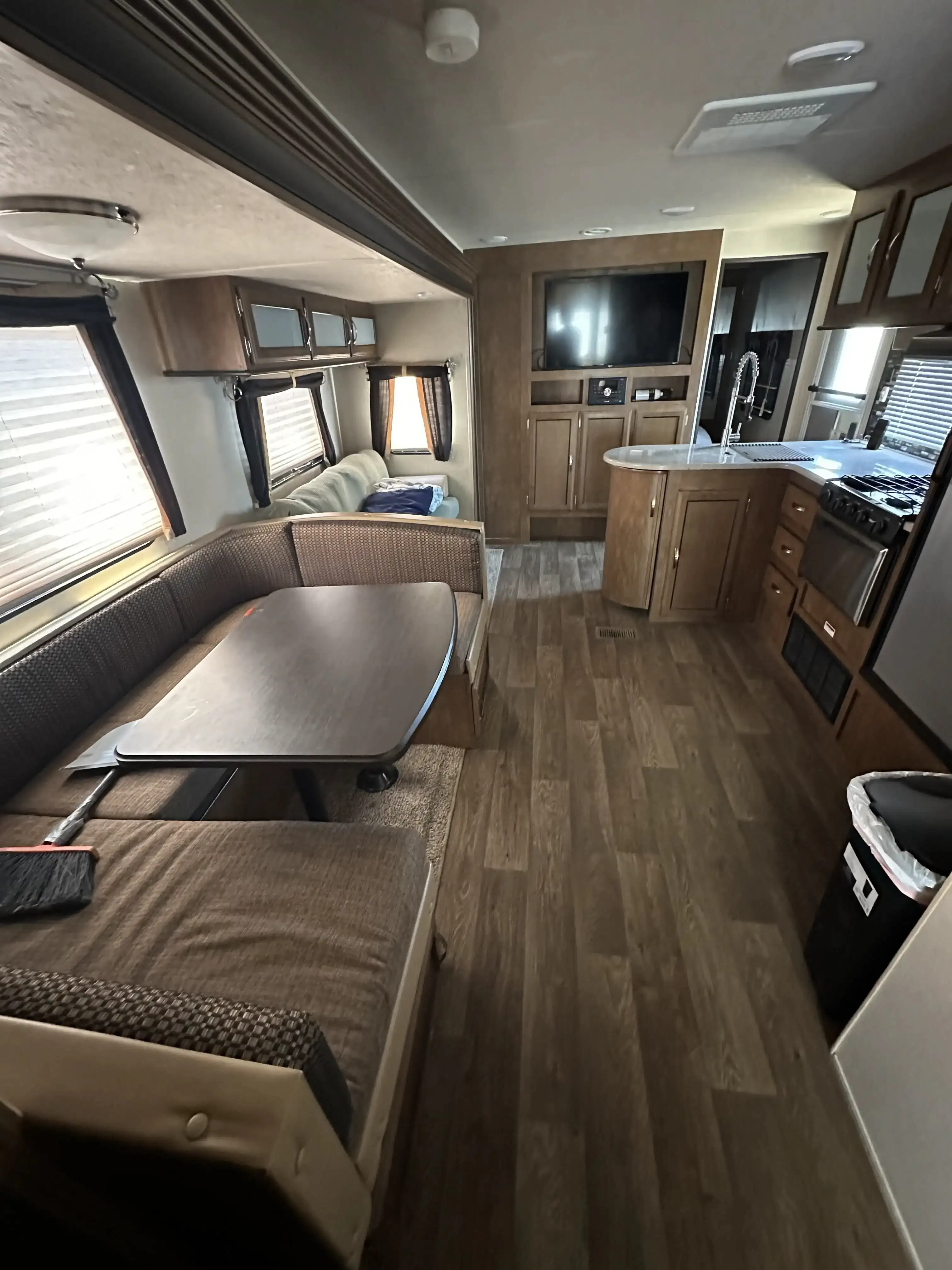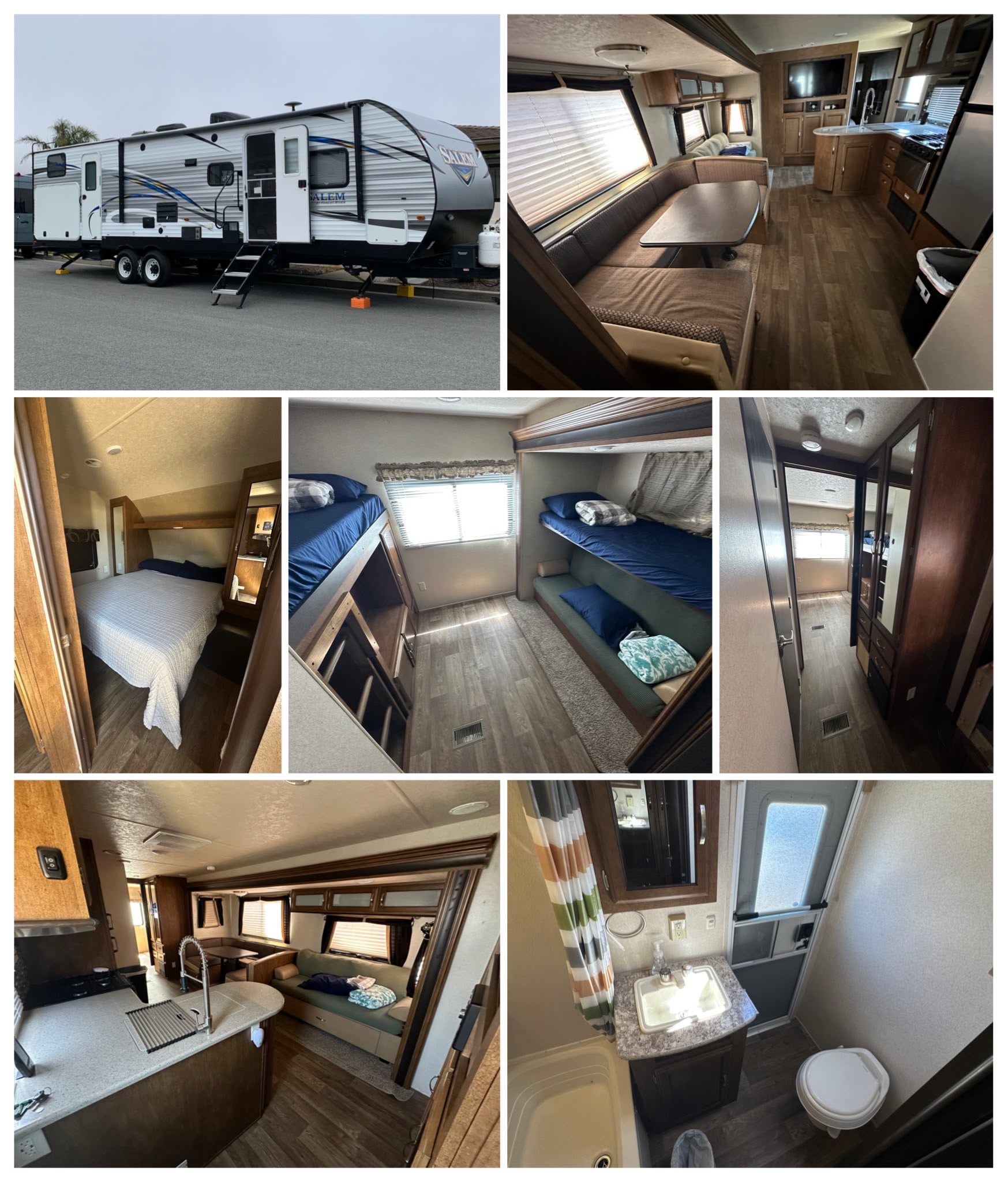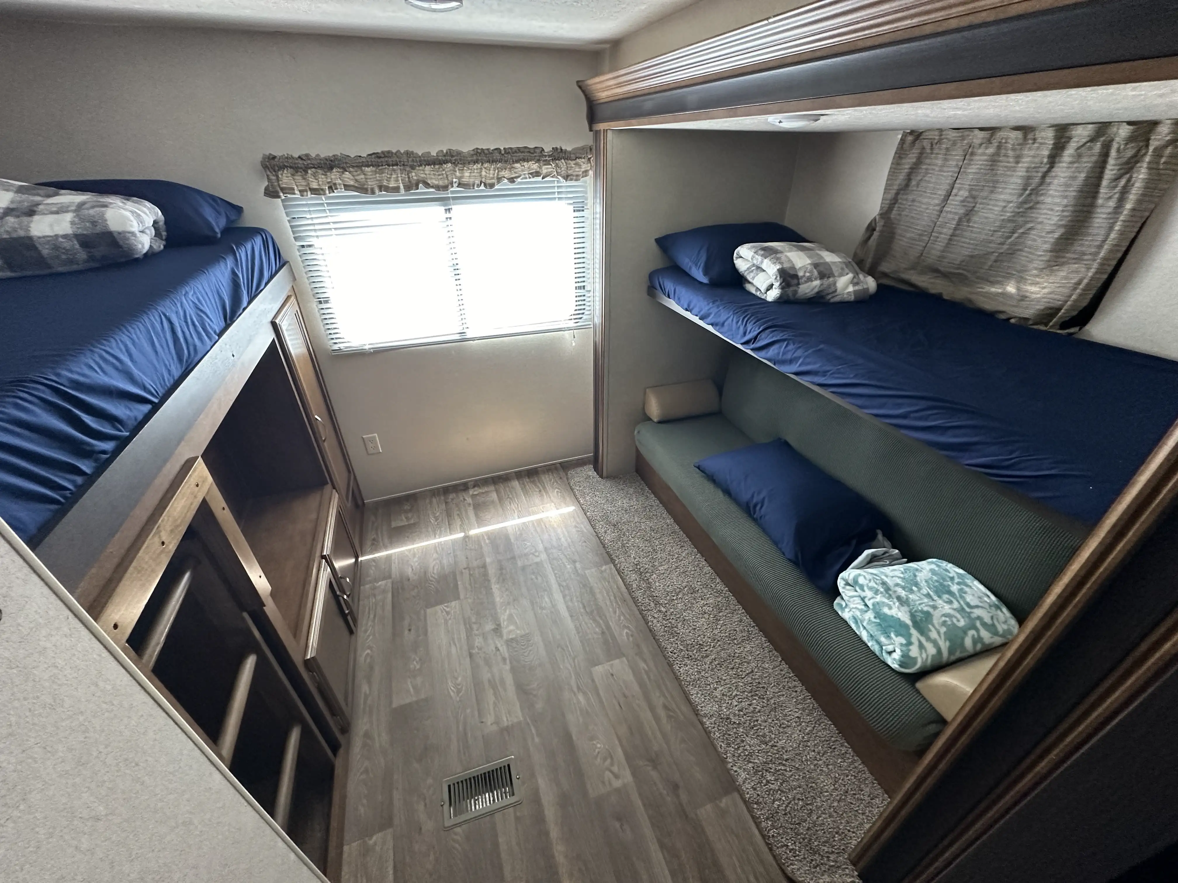 The Salem Bunk House is perfect for making lifelong family memories! It has plenty of room to sleep 8+ people. The master room has a Queen size bed that was recently upgraded. The living area has a pull out couch bed as well as a large dinette that turns into a full size bed. The second bedroom has a couch that turns into a bed, a twin bed and a full bed. The kitchen has everything you need stocked for your trip as well as a good size pantry for all of your food to be put away in. This trailer also has an outdoor kitchen to make the time you spend outside of the trailer even better.